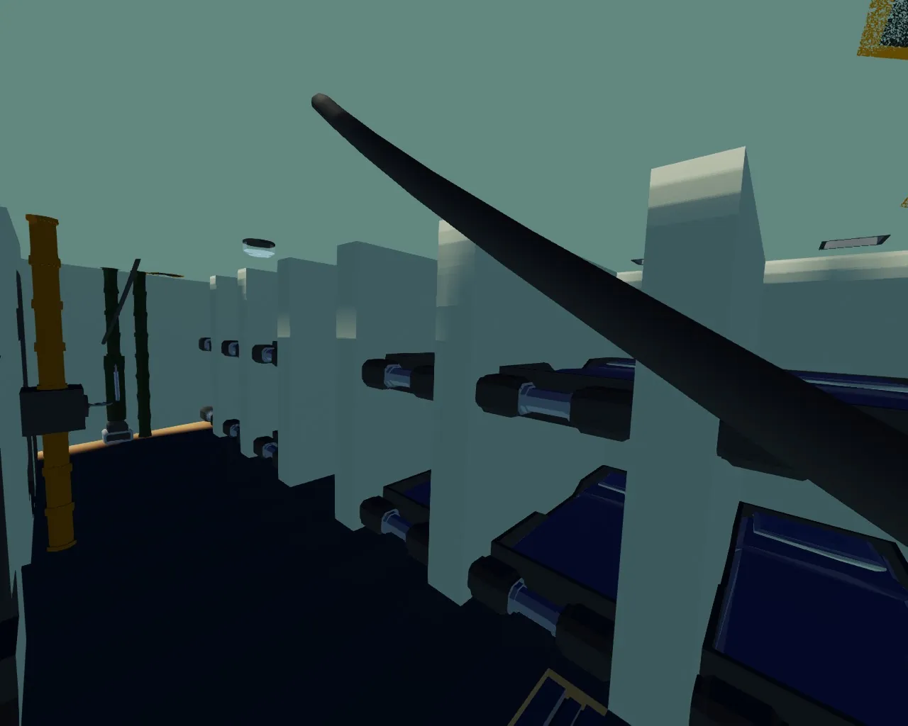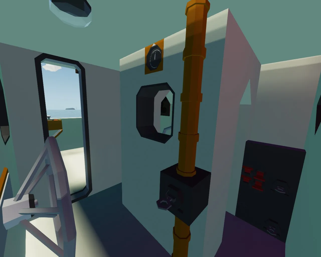 The throttle levers on the bridge wings labeled "Telegraph" are the ones that move the ship since there is no boiler room or engine room.