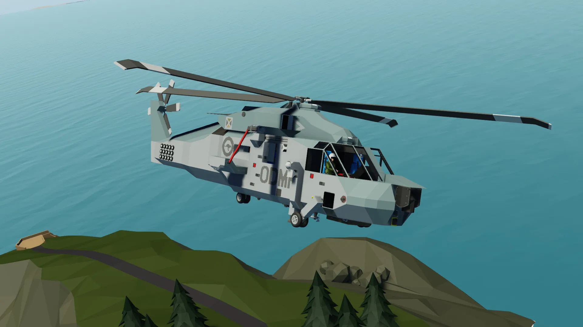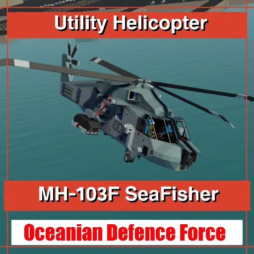 The MH-103F Seafisher is the latest upgrade of the H-103 family specifically designed to fit inside the cramped hangers of the ANZAC Class. Featuring a folding tail it can cut its length down by over 5m. Now upgraded with 2 turbo shaft engines which was a requirement for all ODMC aircraft for Project AIR 5000-2. It has two hardpoints which can fold into the airframe to fit into ship's hangers they are both plumed to hold drop tanks. Still equipped with all the sensors of the earlier Kingfisher the SeaFisher can still act a an ASW and Radar picot.
