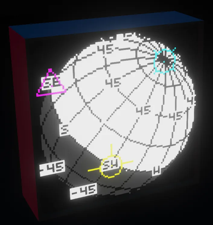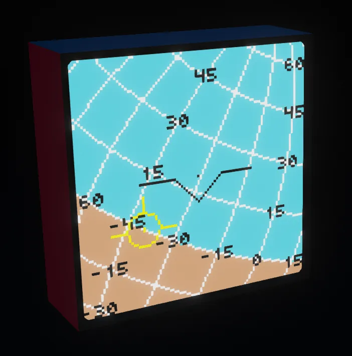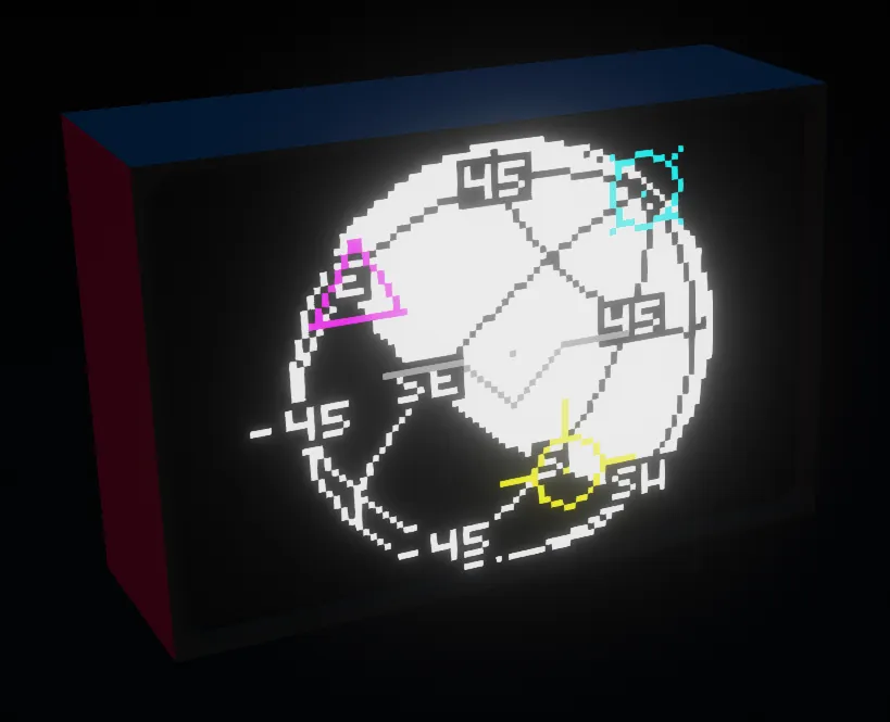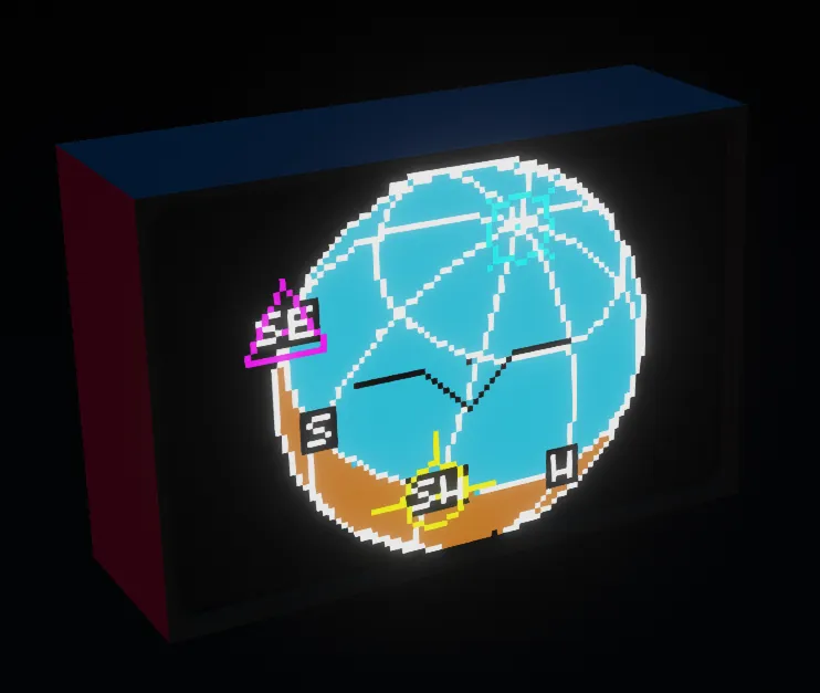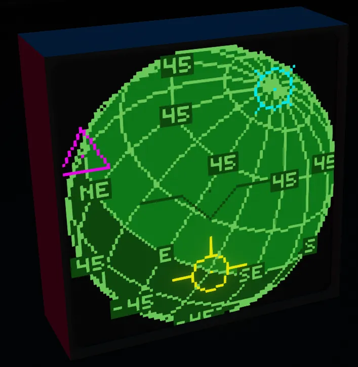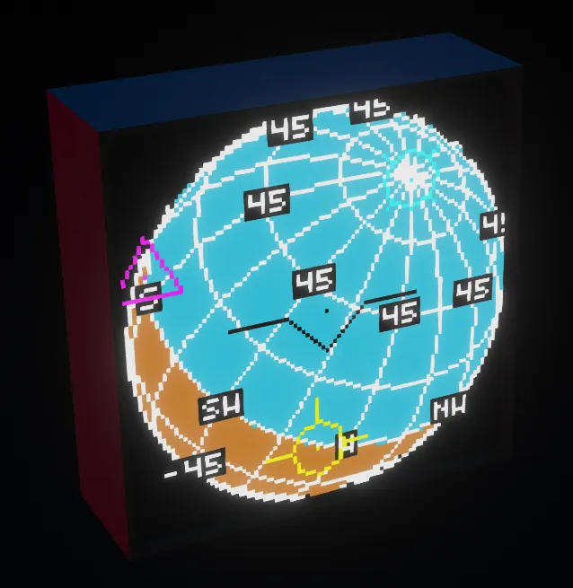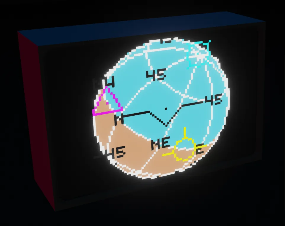 As with the last model, this navball accounts for the distortion present in the astronomy sensor coordinate space, and is able to show the direction of a moving target as well as your prograde vector relative to it. Additionally, this navball is even more straightforward than the last to adapt for a plane! (the astronomy sensor has to be pointing in the same direction the vehicle points, with the big arrow either facing up for a plane or forward for a rocket)