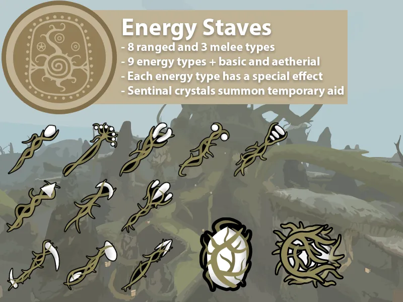 Energy staves are a new, and rather powerful weapon. They come in many different forms, in both the melee and ranged variety. They can be crafted using different salts and extracts, imbuing the stave with an additional effect and a new damage type.