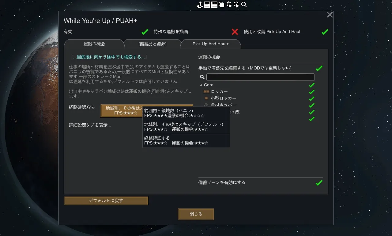 バニラは運搬する機会を仕事(ジョブ)としてサポートしますが、上限があります。[b]開始位置[/b]の近くで運搬が可能で、仕事の目的地近くまで材料資源を保管しようとします。Mod作者はこれらを好みますが、移動経路に沿った運搬を含めるための条件として、このModではそれらの経路計算を削除しています。