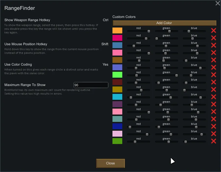 Constantly checking the shooting range of your colonists/turrets? RangeFinder makes it easy.