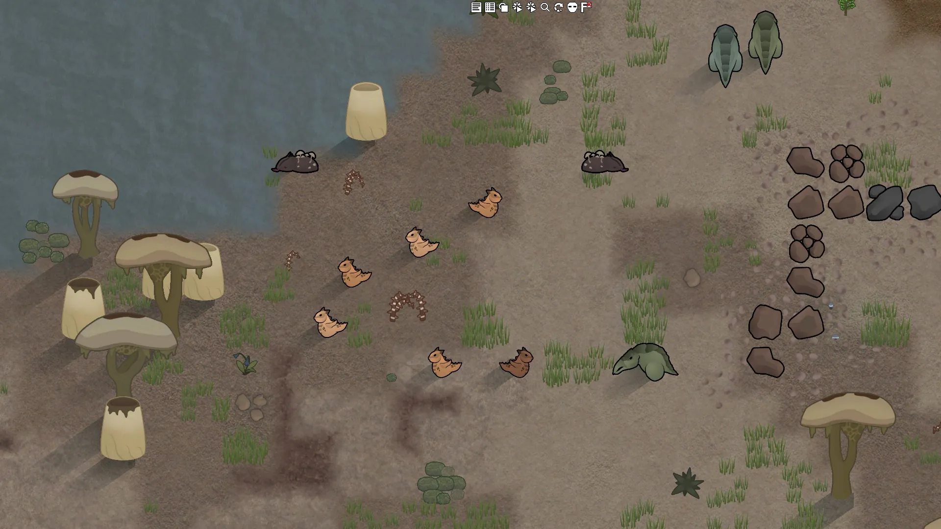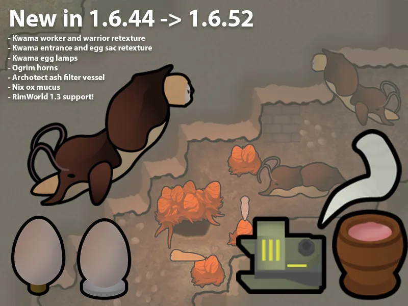 Inaccessible kwama eggmines will generate on the world map. Settling near an eggmine on tiles with caves will have a random chance to generate kwama nests instead of insectoid hives, based on distance from the eggmine. The kwama will remain peaceful, unless threatened. If they are threatened they will aggressively defend their nest, returning to a peaceful state after a period of time. The nest entrances will periodically spawn kwama egg sacs, that can be deconstructed for kwama eggs.