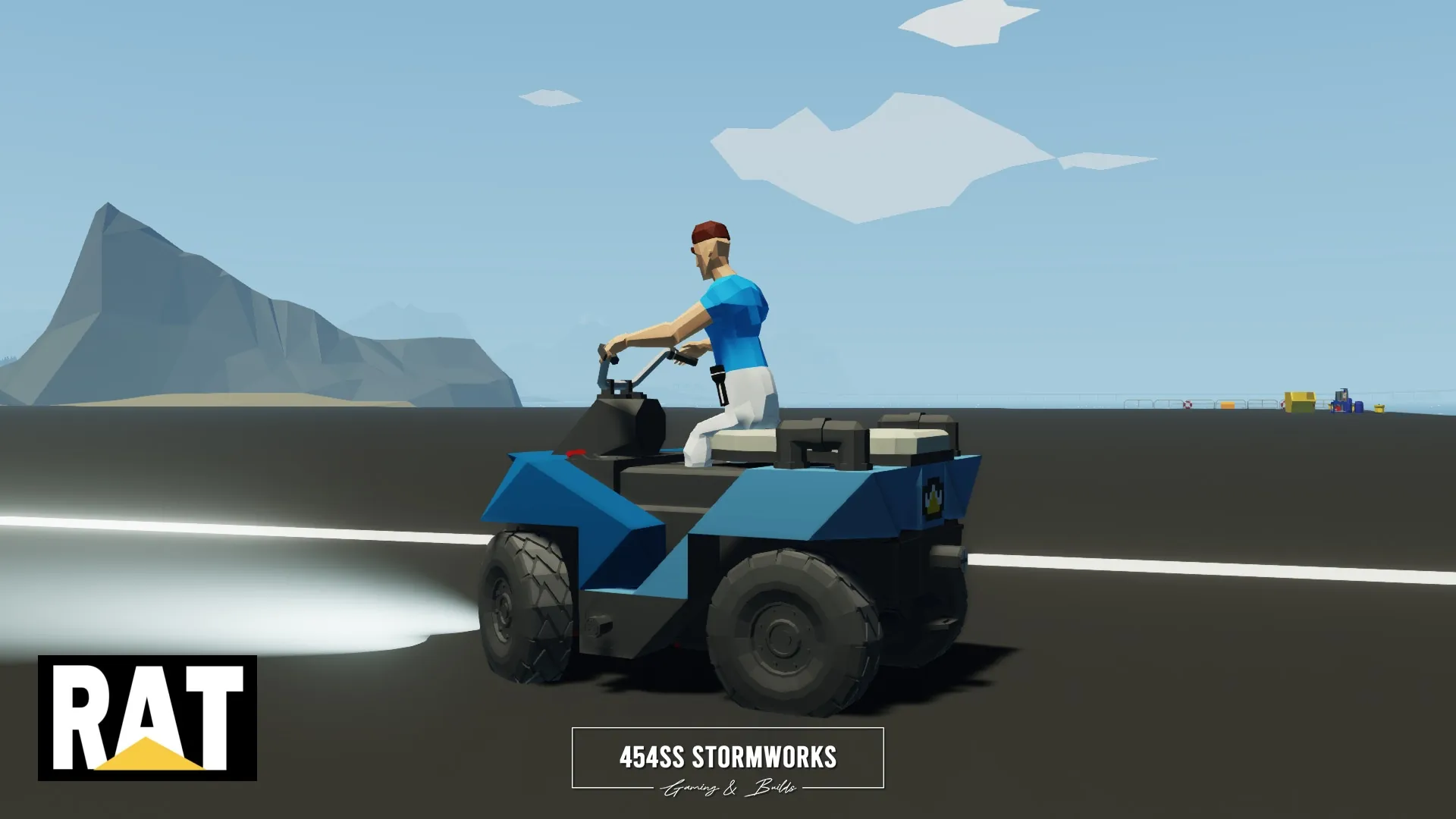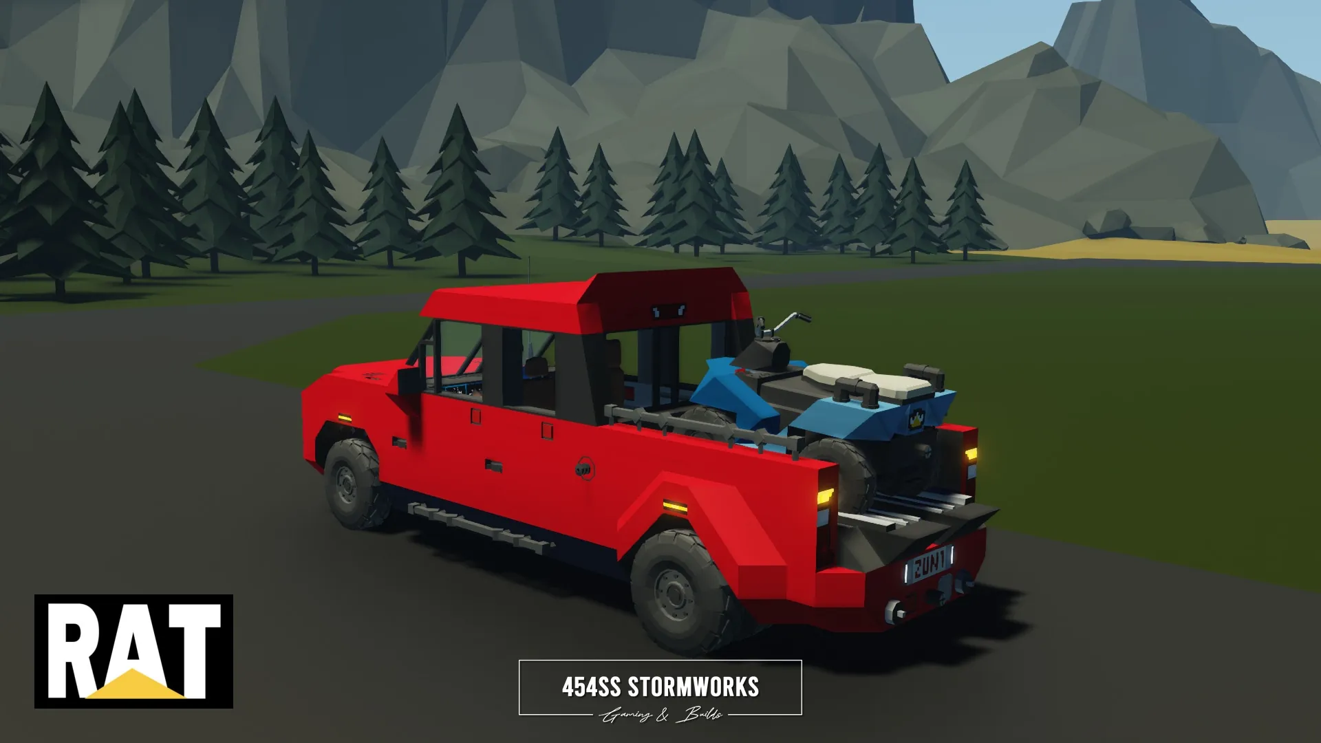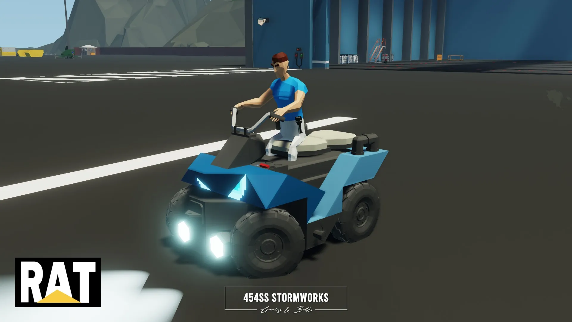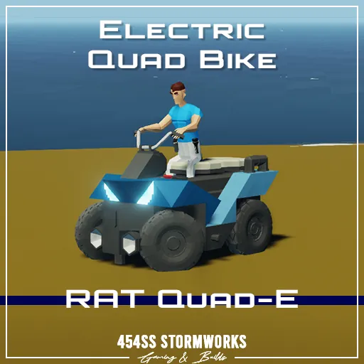 The RAT Quad E is a small, electric quad bike, capable of moderate range and high speeds, light off-roading, transporting two passengers and light towing. It is intended and designed to be used with many larger creations. The bottom is outfitted with an R10 connector, allowing easy pairing to trailers, trucks, boats, helicopters and more.