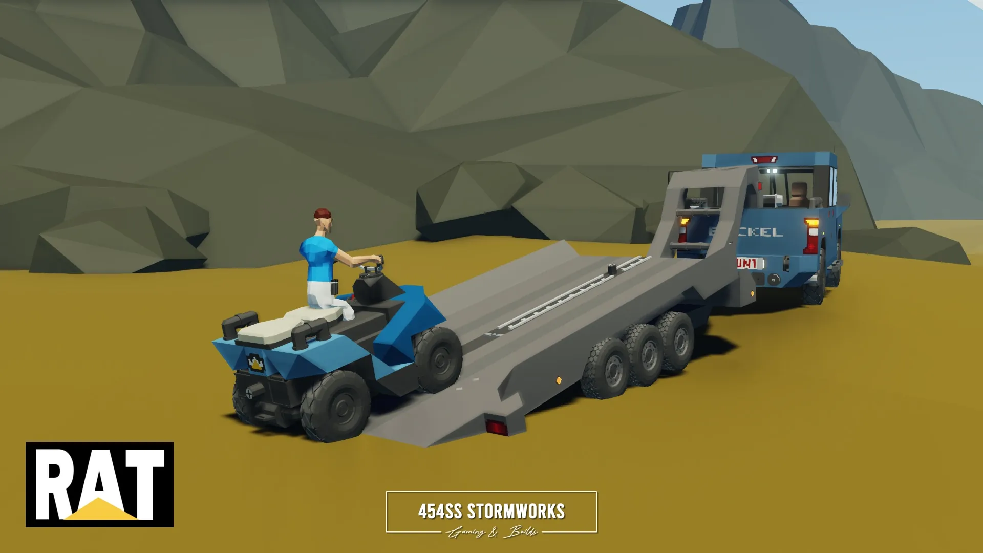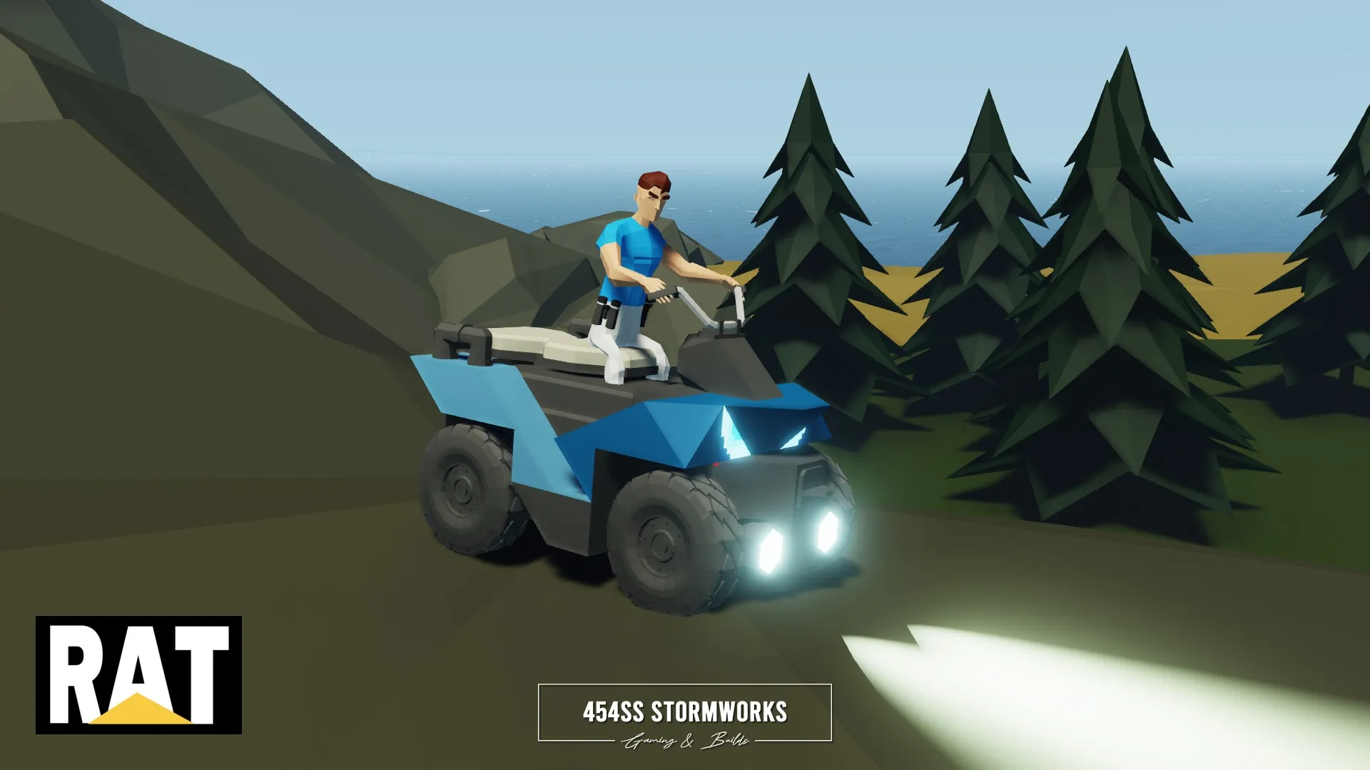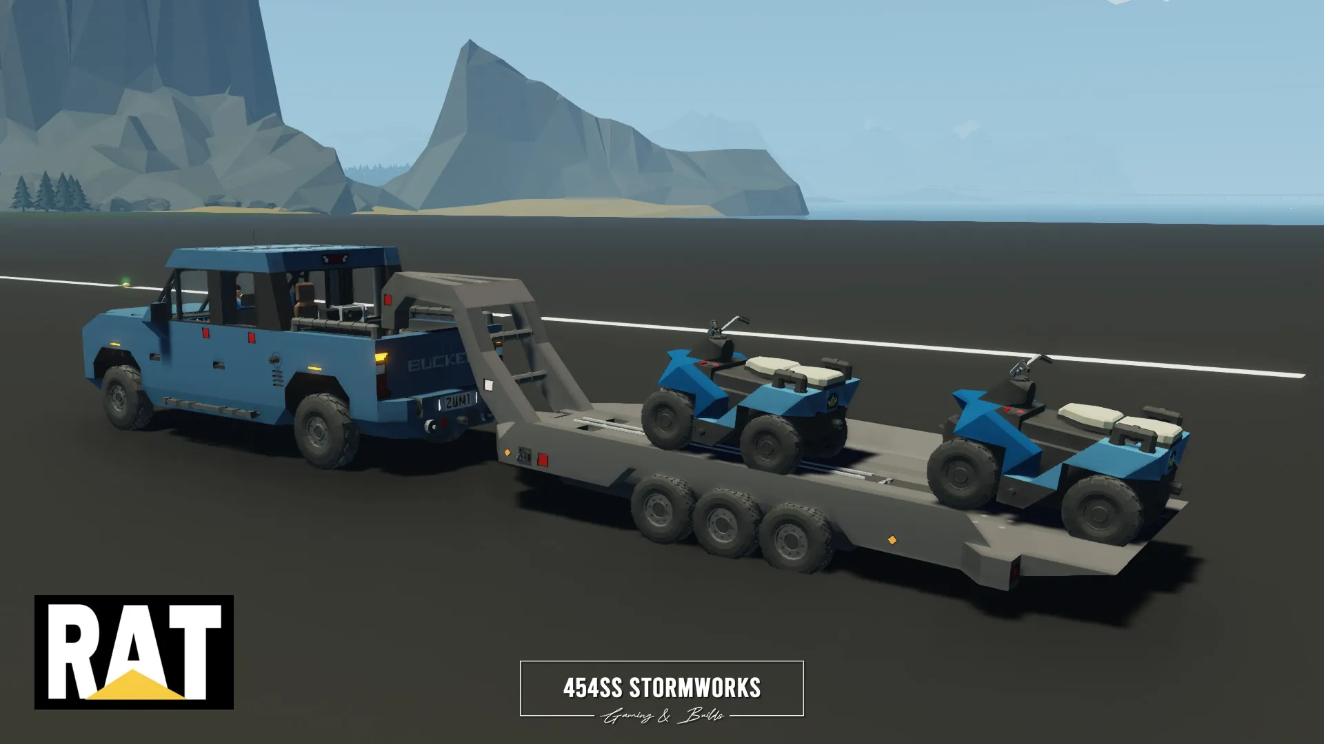 The RAT Quad E is a small, electric quad bike, capable of moderate range and high speeds, light off-roading, transporting two passengers and light towing. It is intended and designed to be used with many larger creations. The bottom is outfitted with an R10 connector, allowing easy pairing to trailers, trucks, boats, helicopters and more.