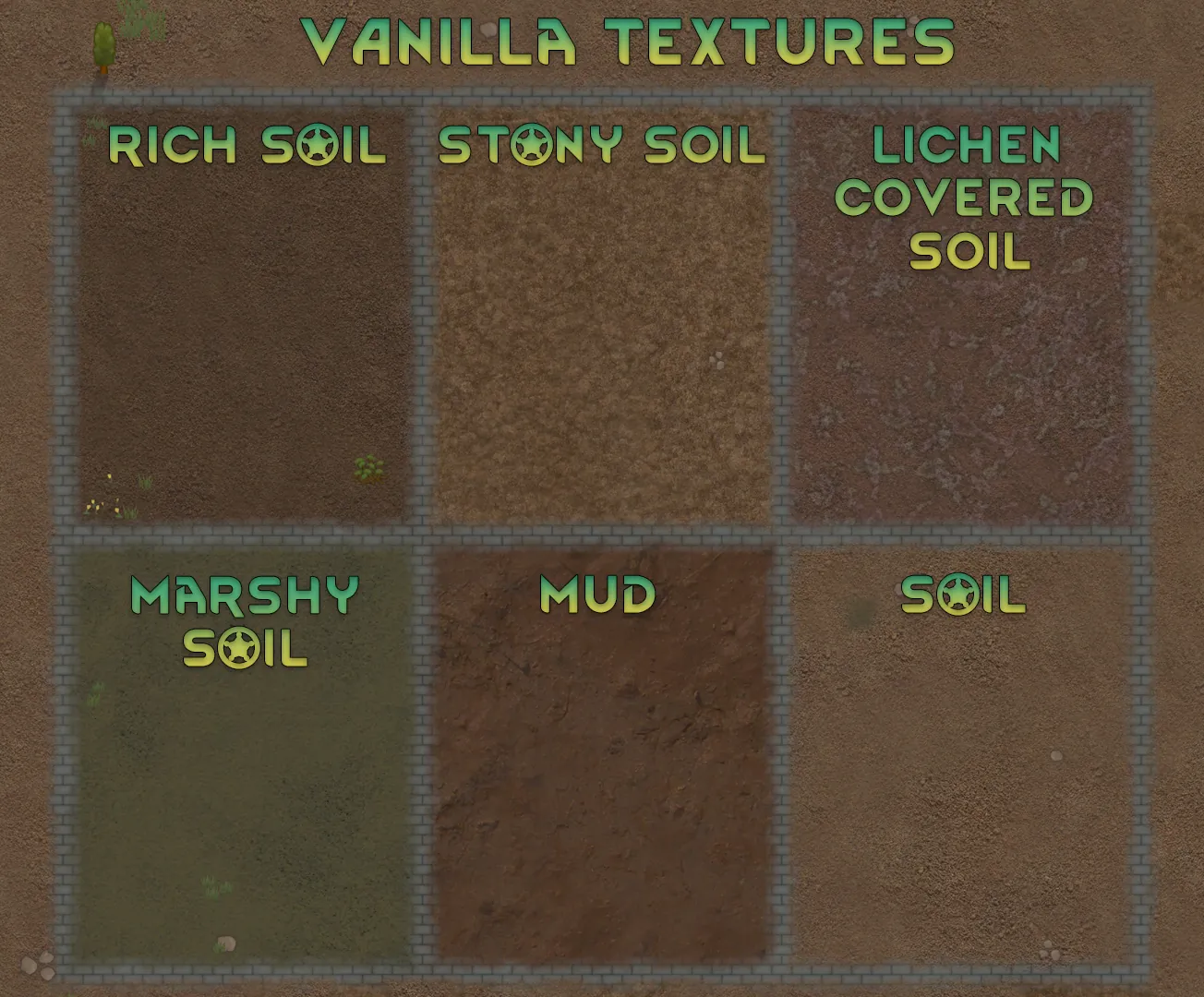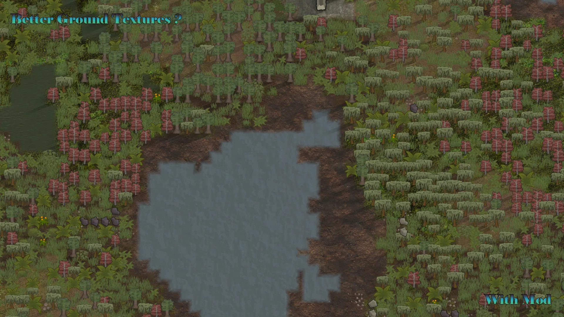 Replaces the most common ground textures for soft materials (not the pure stone ones yet) with textures containing more greens and "life". Still trying to keep it true to the Rimworld look and feel as much as possible.