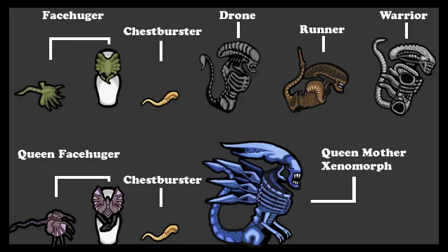 Deon: Drone, Warrior, Runner, Queen Xenomorphs.
