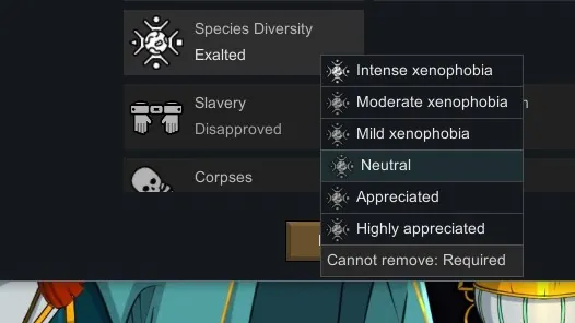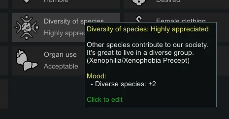 XenoDiversity Precept mod adds a precept that can be selected for your ideologies. This precept allows you to control how colonists react to other Human-like species, their xenophobia or xenophilia. All humans are considered the same species, only pawns from other species (aliens, etc. for example from Humanoid Alien Races) are considered.