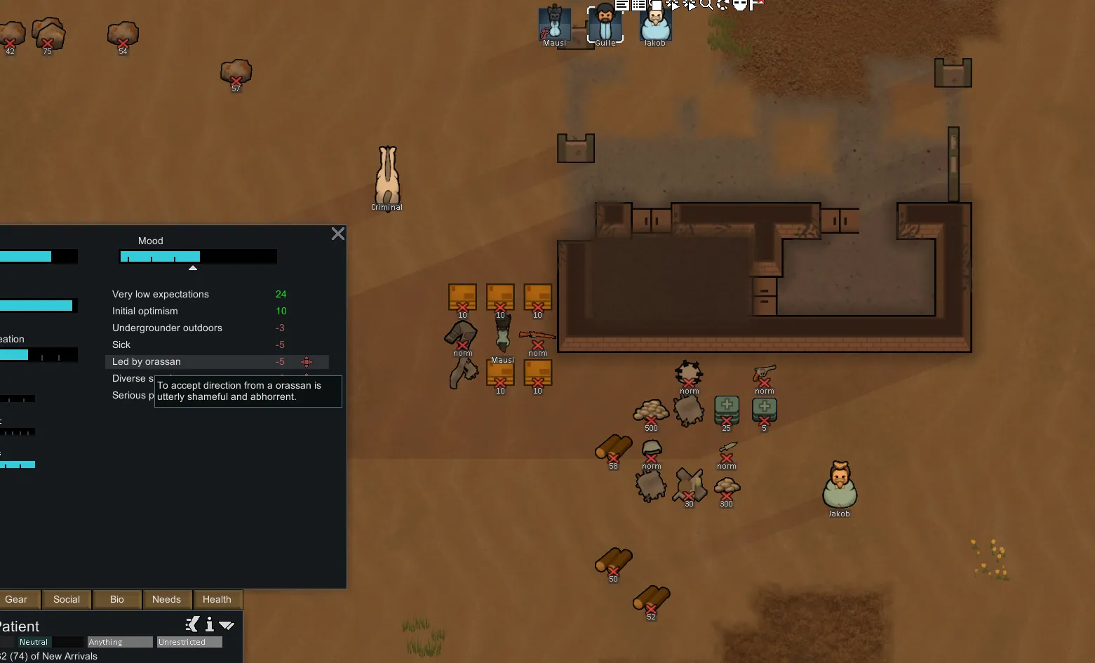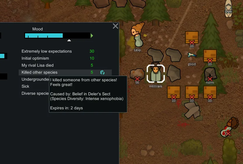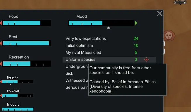 - Positive moodlet if the colony has uniform species (for xenophobes) and negative if there is species diversity. The reverse happens with xenophilia.