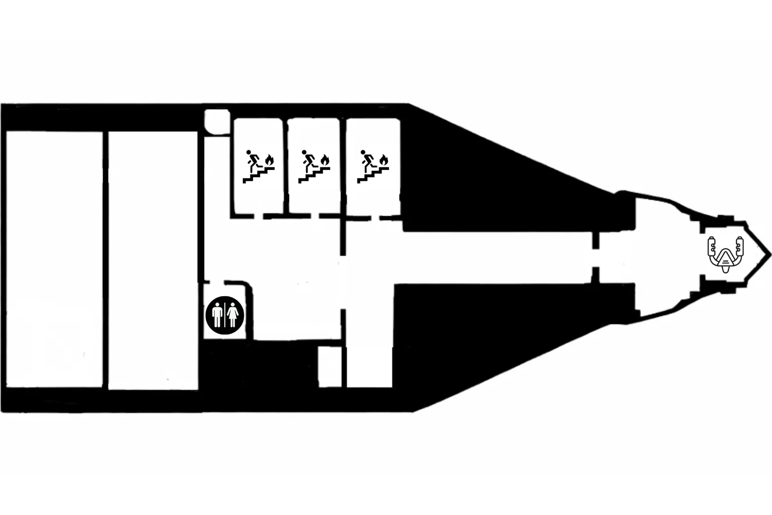 The sign by the front of the ship is pointing to the “secondary entrance/exit”