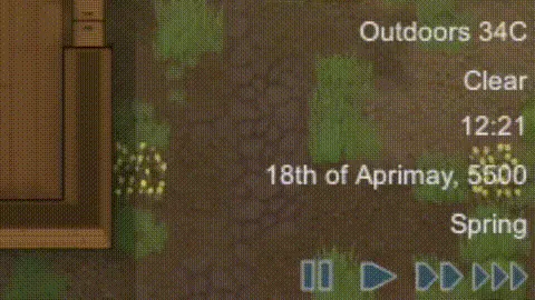 [i](I made this mod primarily to allow for longer days, but those aren't as easy to show in GIFs. Also, extremely short days can be kind of funny - raiders give up almost as soon as they spawn, winter starts and finishes before pawns have time to get hypothermia, and it generally feels like your colonists are Ents.)[/i]