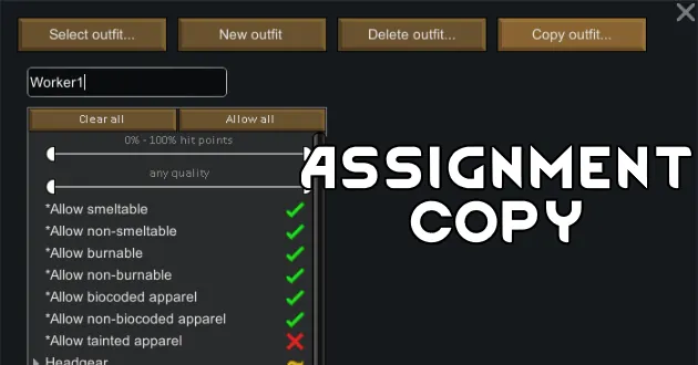This mod allows you to copy the selected outfit, drug policy and food restriction in their respective managers.