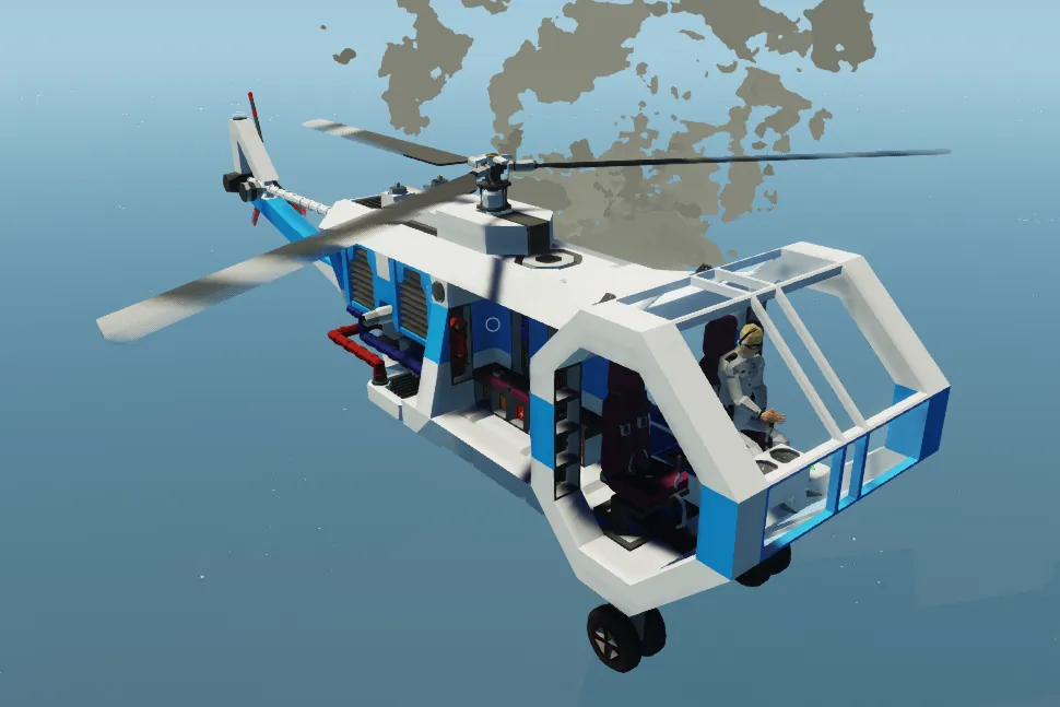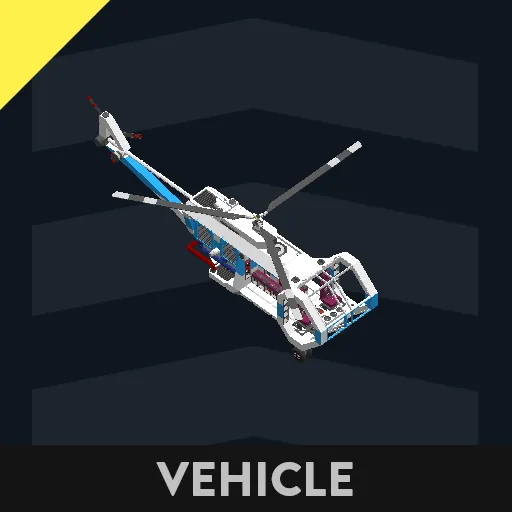This helicopter has a two-engine scheme and passive cooling in the form of simple radiators. Keep in mind that this helicopter was built for use in the early stages of the "Career" mode (so for its spawn you will need only a couple of technologies - "Helicopters" and "Sensors" ("Sensors" are optional, the helicopter functions without them). It cannot land on water... But it can hover over it. The pilot's seat is trimmed initially.