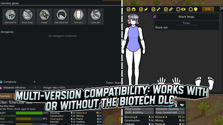 Bring Ellen Joe from Zenless Zone Zero, a unique character, to your Rimworld. This mod adds the "Thiren: Shark" xenotype, exclusive apparel, and a dedicated quest.