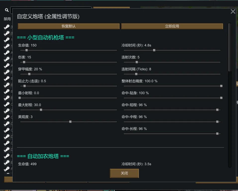You can now adjust the data of the vanilla turrets in the settings. Among them, the Uranium slug turret adds a toggleable explosion effect, and the explosion range can also be adjusted in the mod settings.