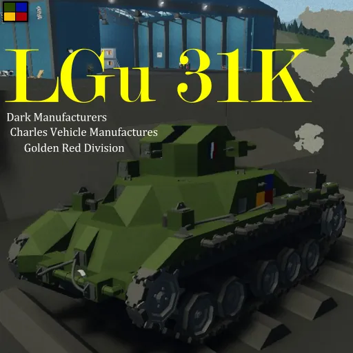 The LGu 31K is the first, non-converted Light Tank designed by Dark Manufacturers. The LGu 31K was designed by Golden Red Division [GRD] (1922-1953) of Charles Armoured Vehicle Manufactures [CAVM] back in Mid 1928. However, CAVM was only allowed for Conversion of Tanks and other Vehicles and was banned from producing stand-alone Production Variants of Tanks and Caterpillar Vehicles due to Vicker and the folks at 'The Land Cruisers Department of Dark Manufacturers' was salty after the Saint-Charles Tank which was Design and Produce by CAVM. This lead to only 7 'Prototype' variants of the LGu 31K [1] was produce.