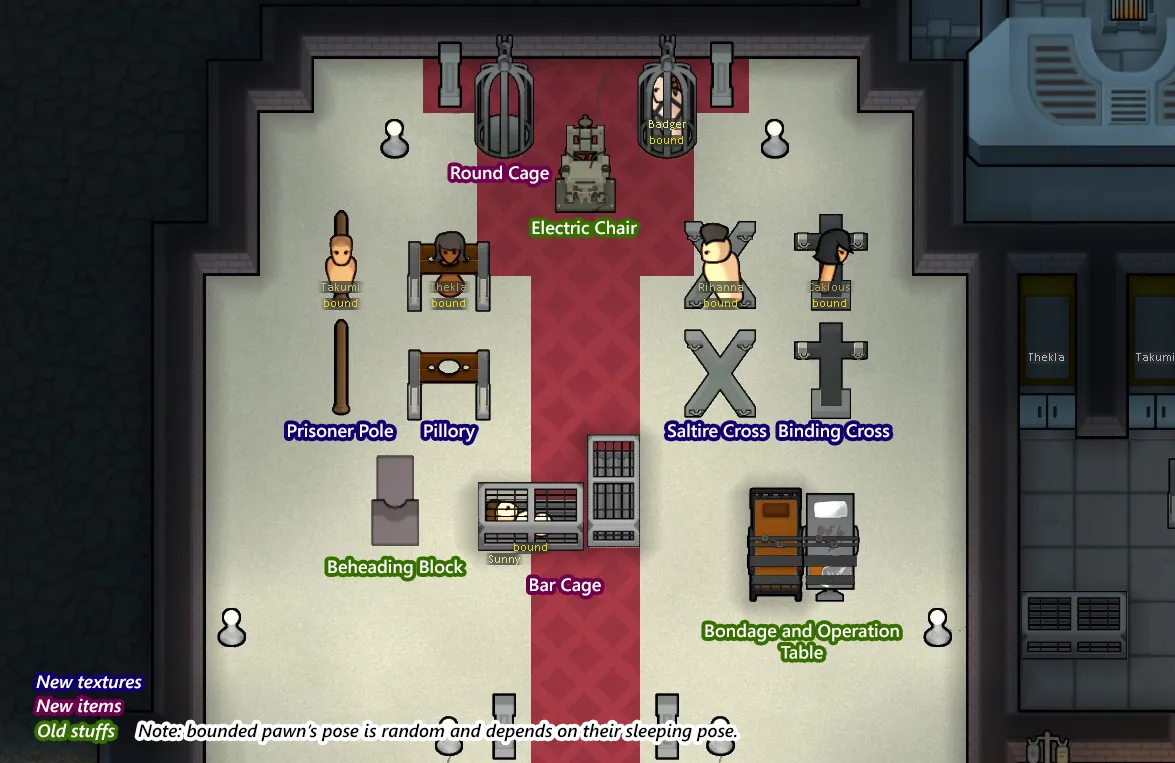 - Cannot put bondage furnitures outdoor, will fails to bind prisoner. This is an inherent issue from Bondage Bed mod.