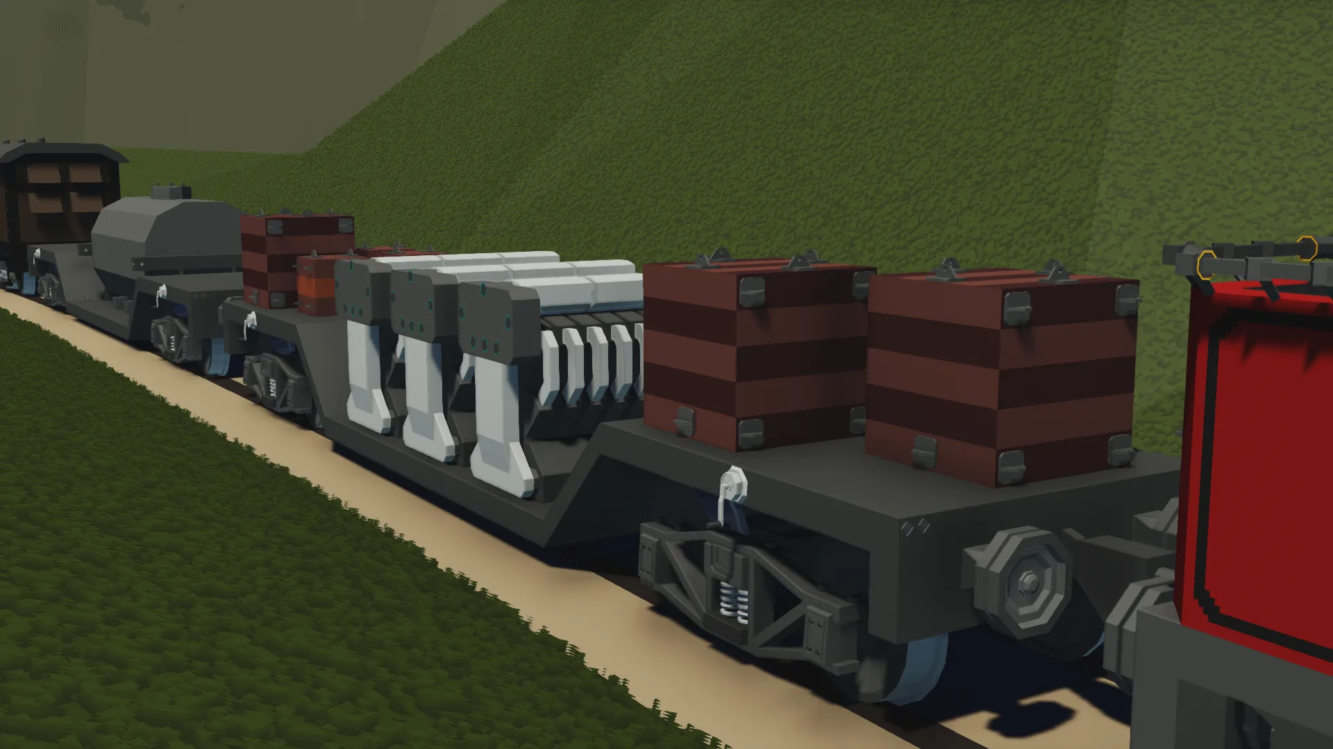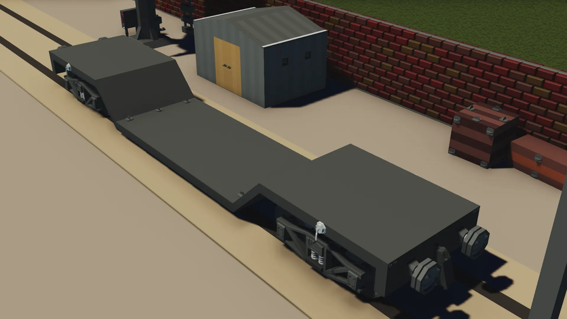 Well Wagons are a type of rolling stock similar to flatbeds, albeit with a lowered section in the middle. They are used for transporting loads that would otherwise be too tall for a normal flatbed, such as heavy machinery, vehicles, and even engines.