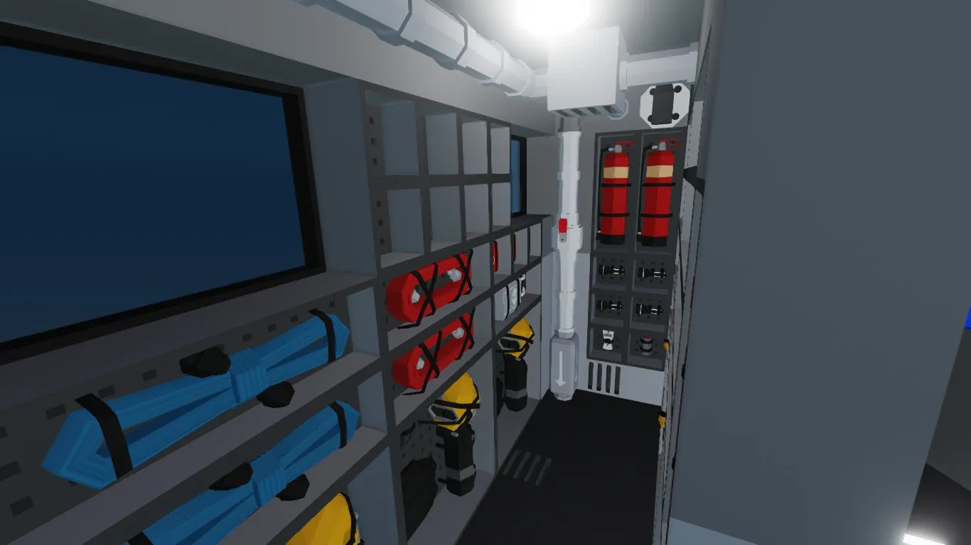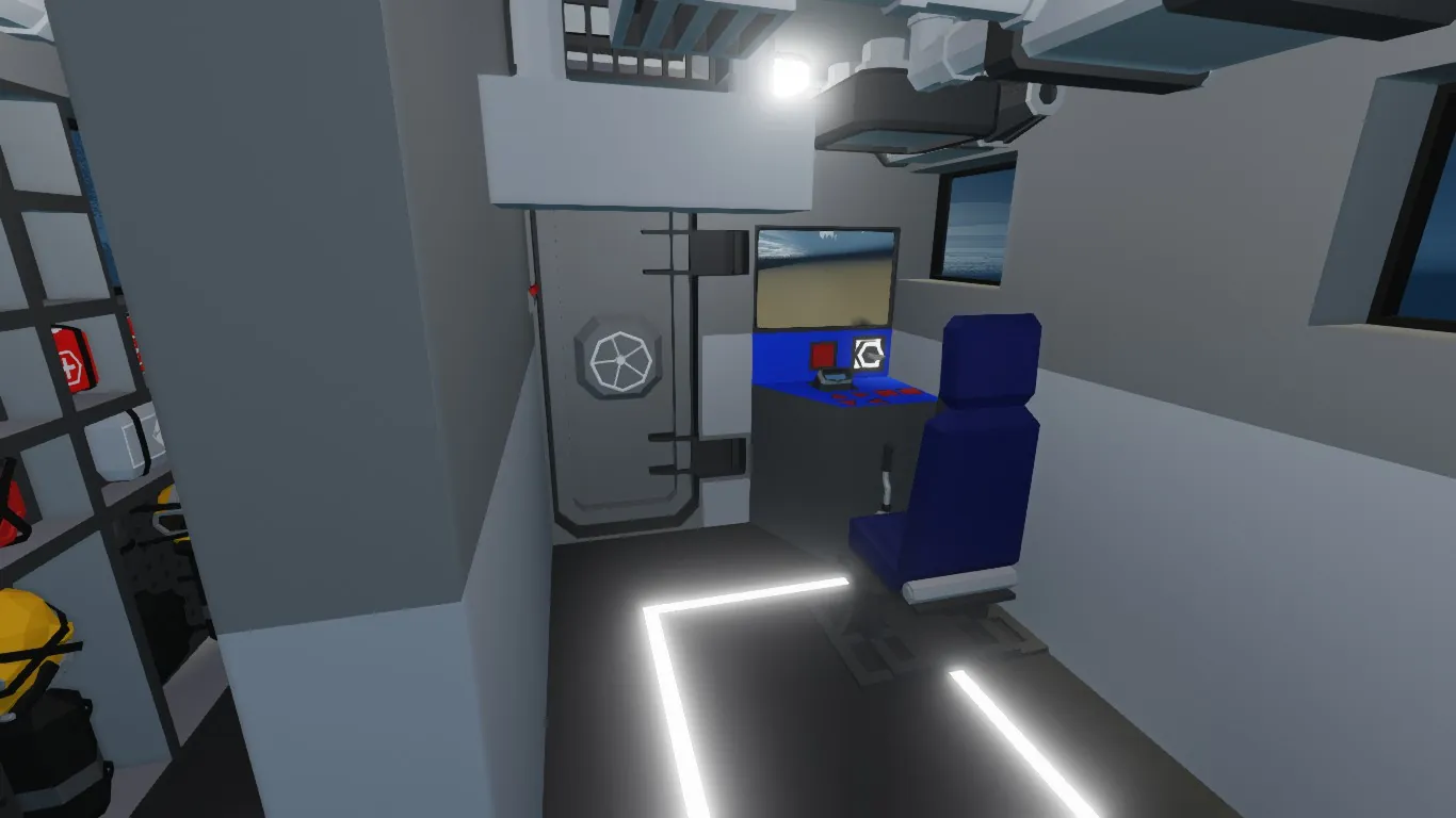 A state of the art moonpool allows for easy access to the underwater world. To use the moonpool, equalise the pressure to the outside pressure and then open the hatch. Some water will get in but not much. The moonpool can be used at depths of over 250m. (250m is the limit players can dive to in Stormworks).