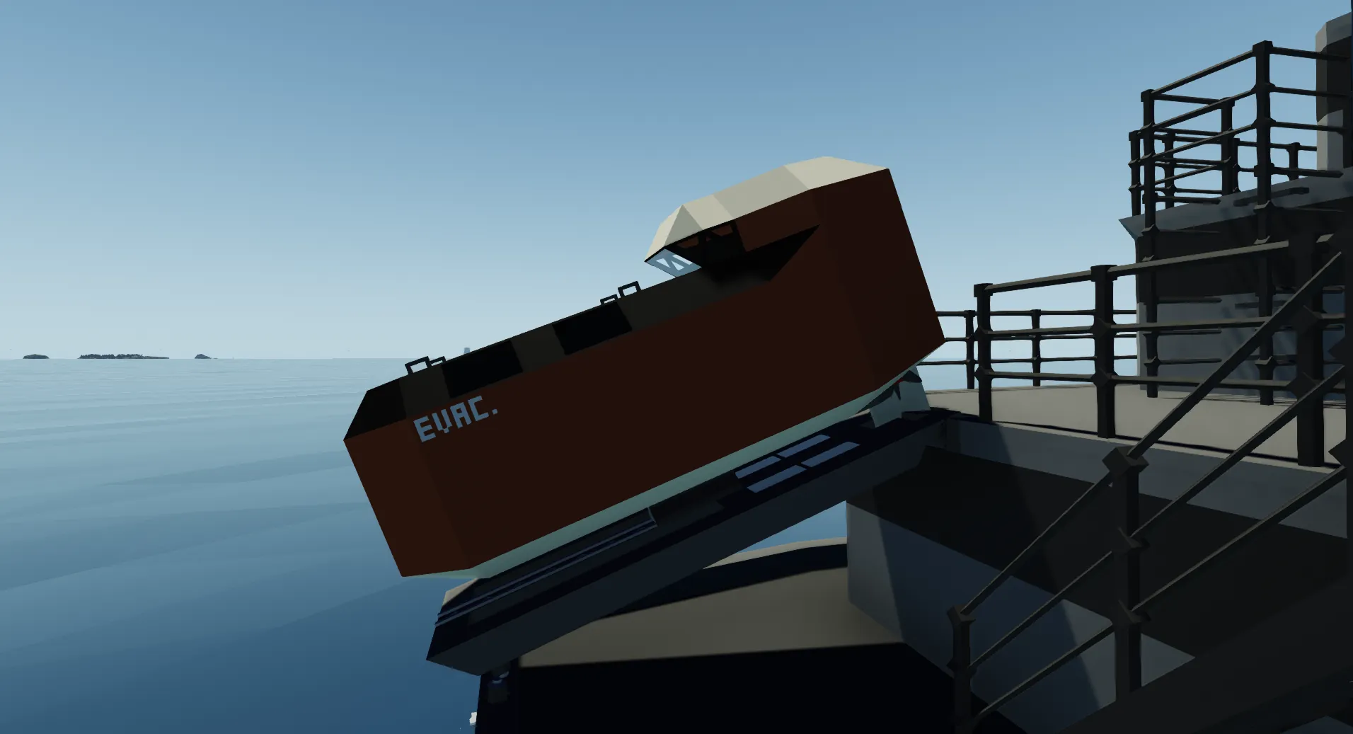 The EVAC Dropboat Class-S (small), as shown in the images is meant to be attached to slanted rails on the rear of a boat.