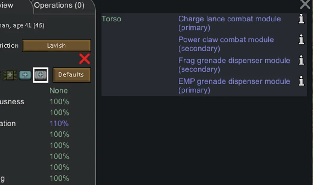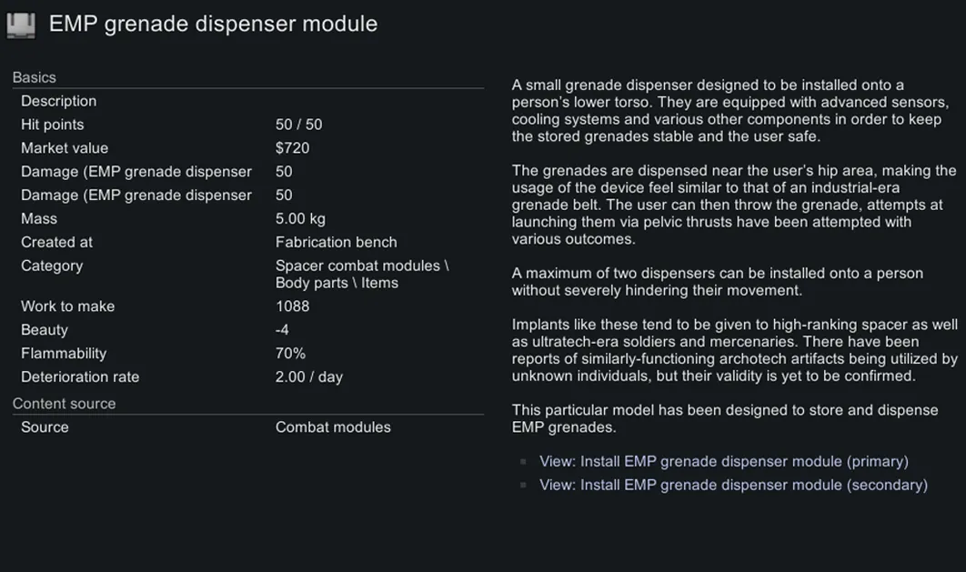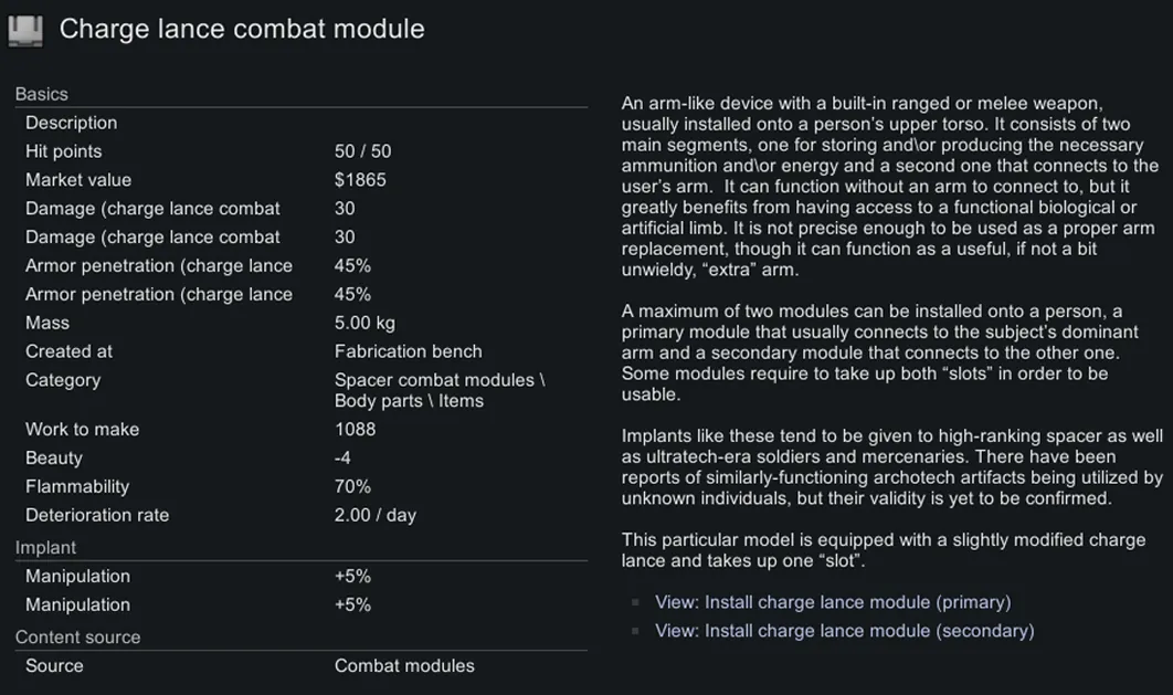 This mod adds combat modules, combat-oriented implants that don’t replace any of the pawn’s body parts.