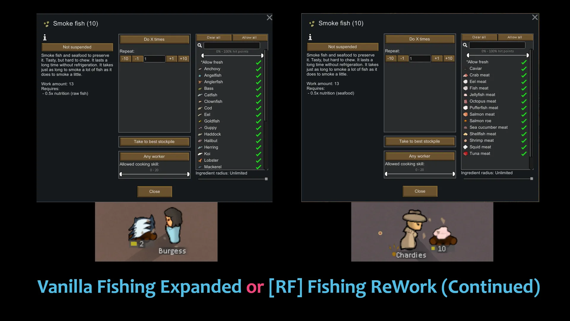 [url=https://steamcommunity.com/sharedfiles/filedetails/?id=2920098766][RF] Fishing-ReWork (Continued)[/url] OR [url=https://steamcommunity.com/sharedfiles/filedetails/?id=1914064942]Vanilla Fishing Expanded[/url]