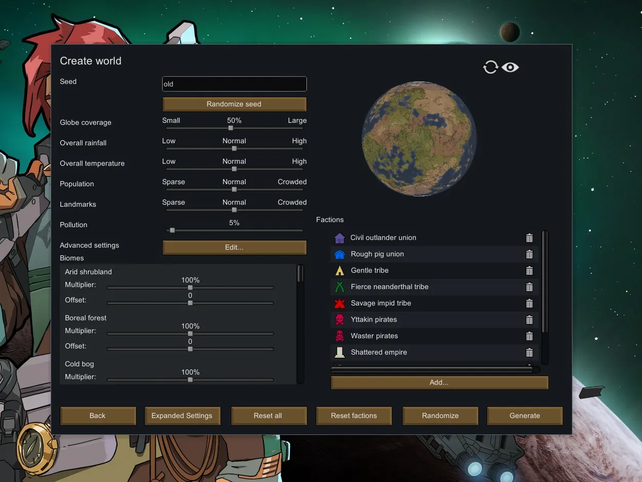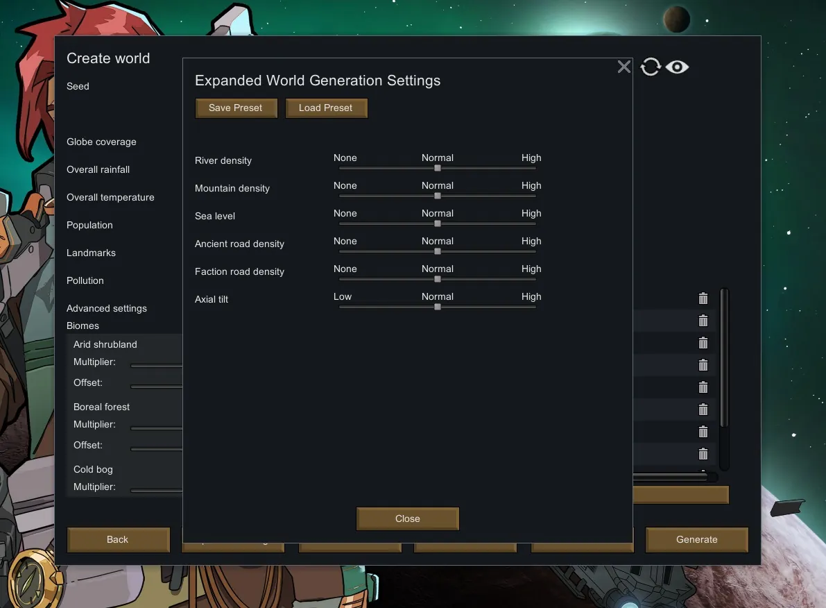 Have you ever wished you could tweak the world you plan on to your liking? Remove certain biomes or roads? Make one biome spawn less or more? Make the world the size you want and not the one pre-selected for you? Have more mountains or only the sea with a few islands? Or save your world as a preset for later colonies? Or share that preset with a friend?