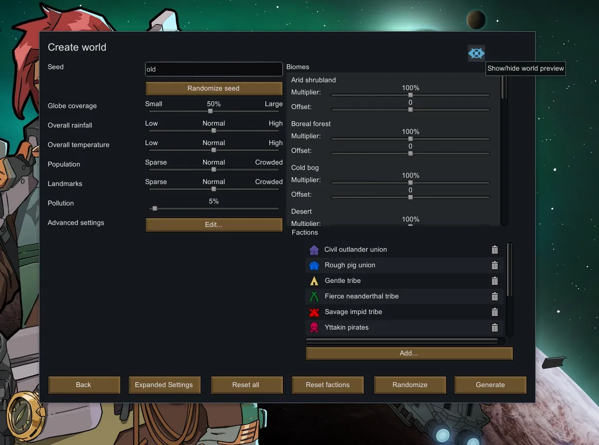 - Added a "Hide preview" button. Gives more room to biome and faction-settings and does not consume resources by regenerating the preview when changing values.