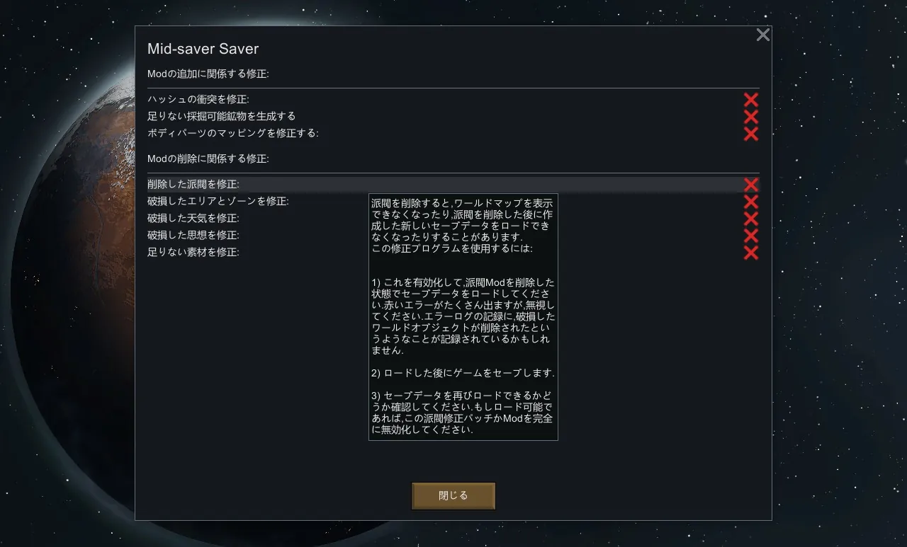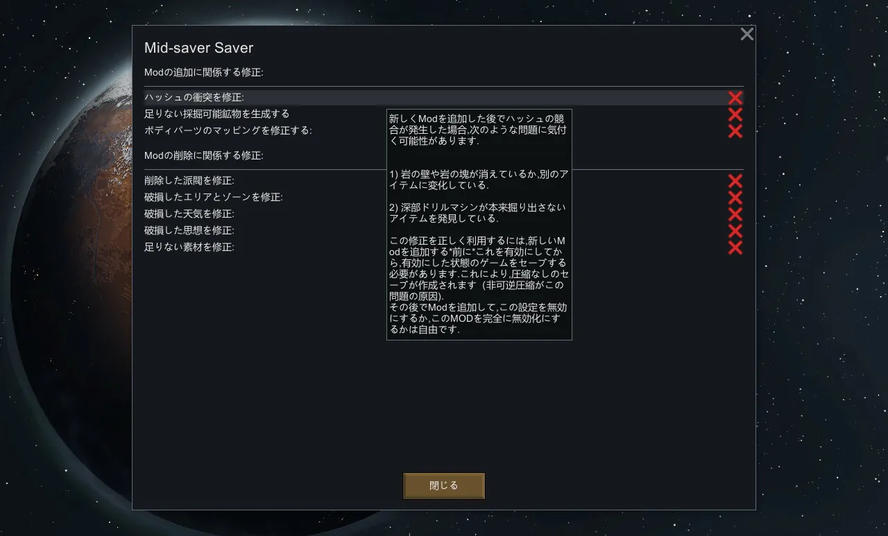 This Mod is adding a Japanese translation to the original Mod "[url=https://steamcommunity.com/sharedfiles/filedetails/?id=2921585989]Mid-saver Saver[/url]"(1.4), "[url=https://steamcommunity.com/sharedfiles/filedetails/?id=3261311100]Mid-Save-Saver Continued[/url]" (1.5-1.6).