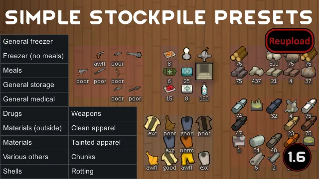 A mod that adds various presets for stockpile settings in a comfortable float menu. You can use them to easily set often used storage configurations, both generic ones (like freezer stuff) and specific ones (like food, drugs, weapons or clean apparel).