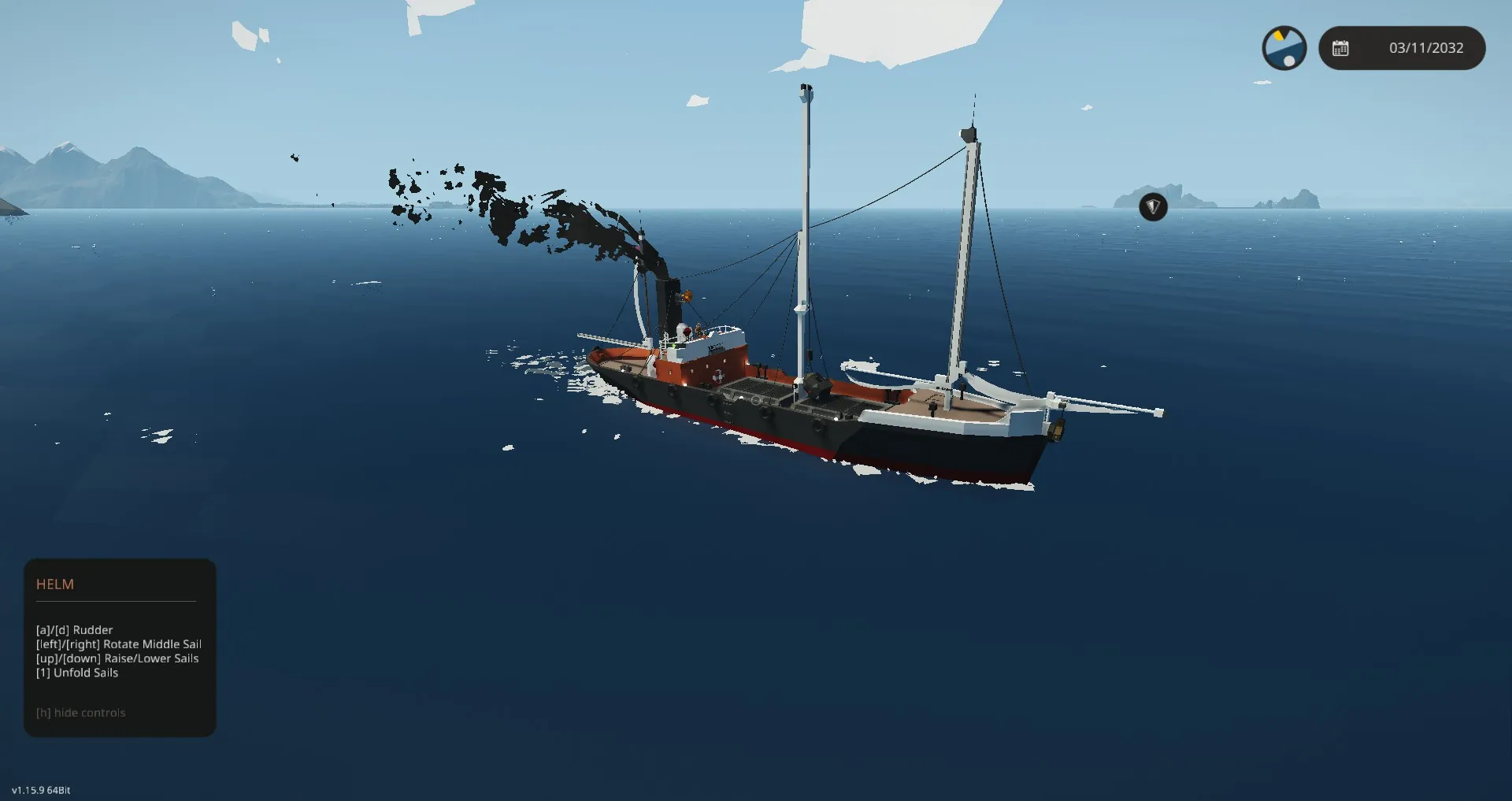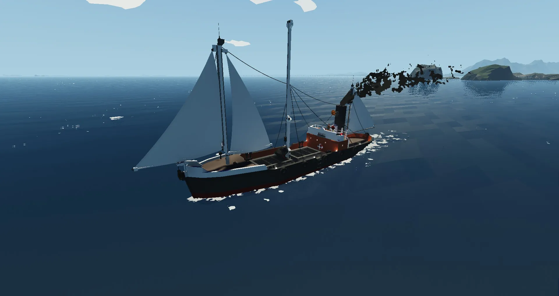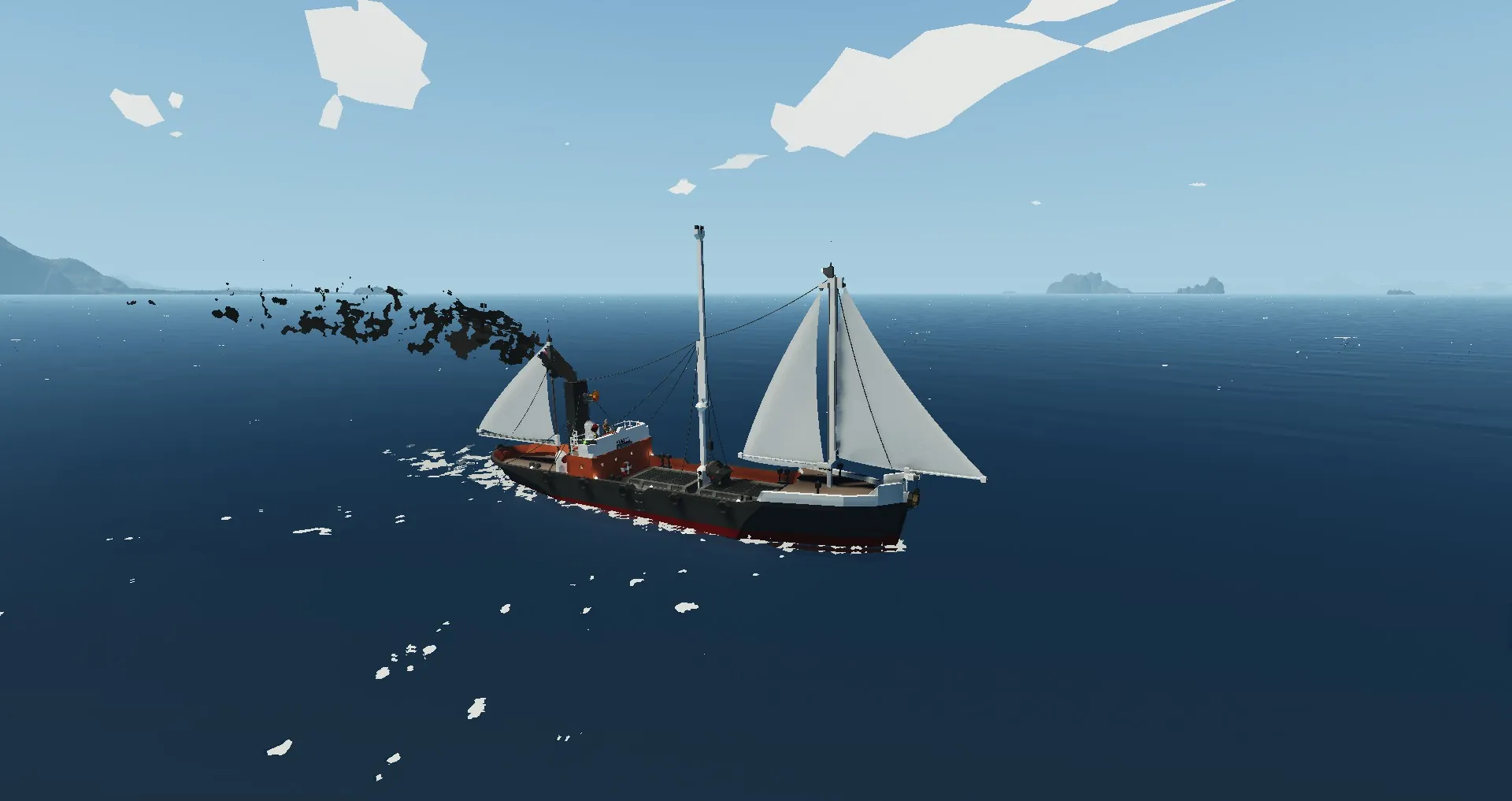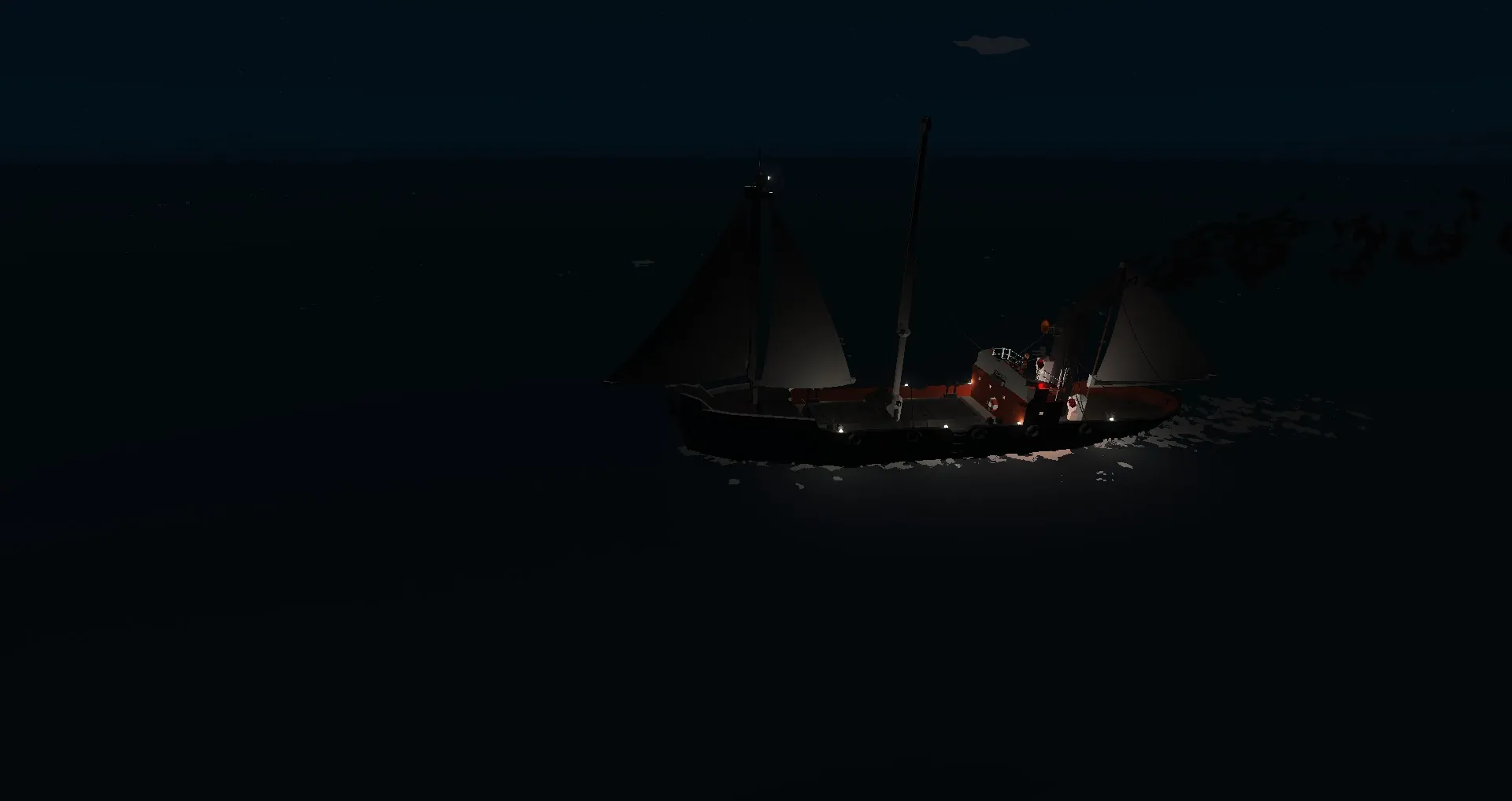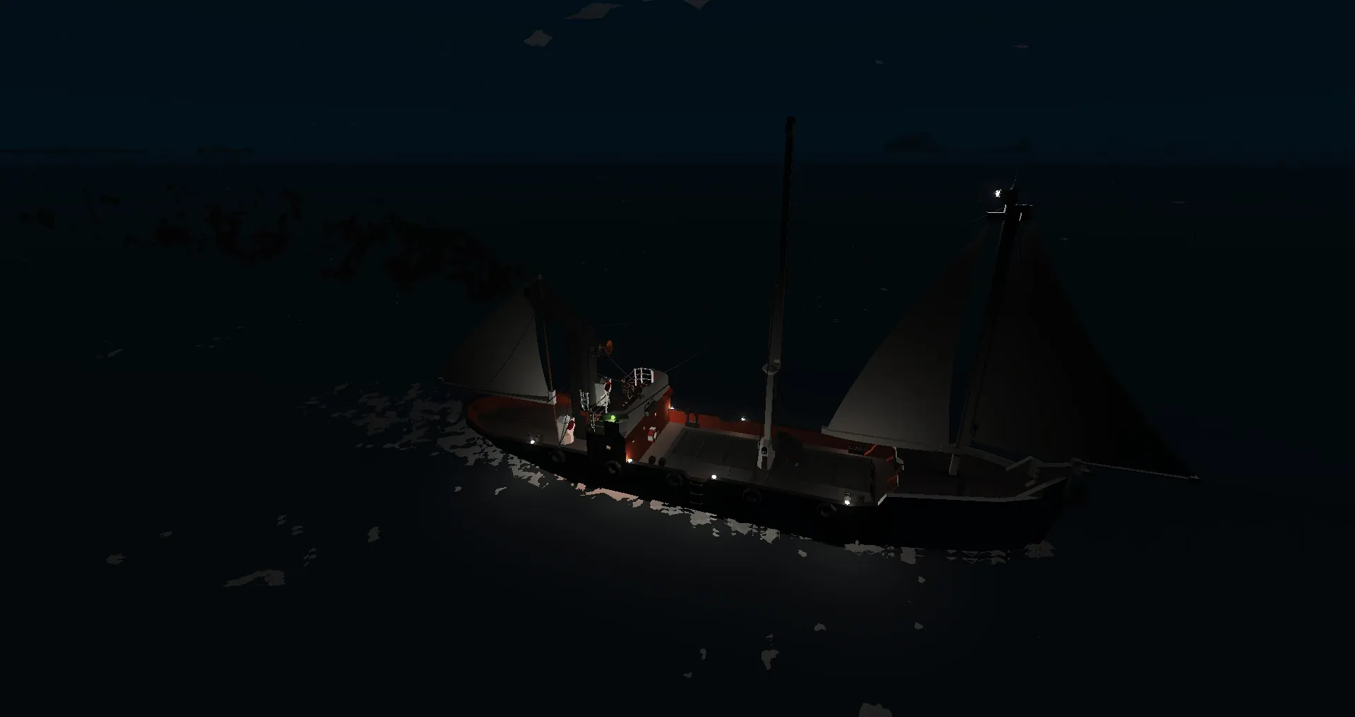 This ship is equiped with Auxillary sails that can provide 3.5 kn of speed down wind. (no sails on the real life shp)