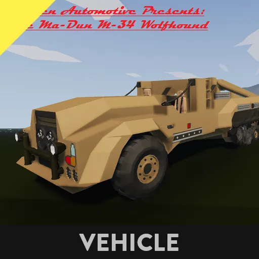 Built in 1972 right after Western Automotive purchased the dead husk of Ma-Dun Heavy Industries from Buckshot Industrial Motors, The M34 Half-track throws out the book on casual large truck conversions and instead was designed from the ground up as a Half-track. Featuring a vertically opposed 10-cylinder engine it has a top speed of around 7.5 to 8 M/S. With its large bed you can fit 10 buddies or random paid employees onboard in the shaded bed.