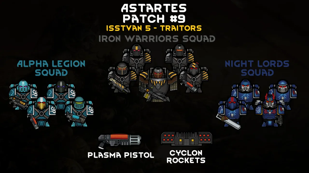 A: 10 variants of the Spacemarine's power armor, in the coloring corresponding to the different legions. I have tried to depict the armor as it was when the Horus Heresy began (30k). Astartes weapons are represented by bolters and plasma weapons, for those who like close combat there is a power sword. To emphasize that the Astartes warrior is many times stronger than a mere mortal, I added progenoids, which can be installed to an ordinary man and turn him into the best defender of humanity.