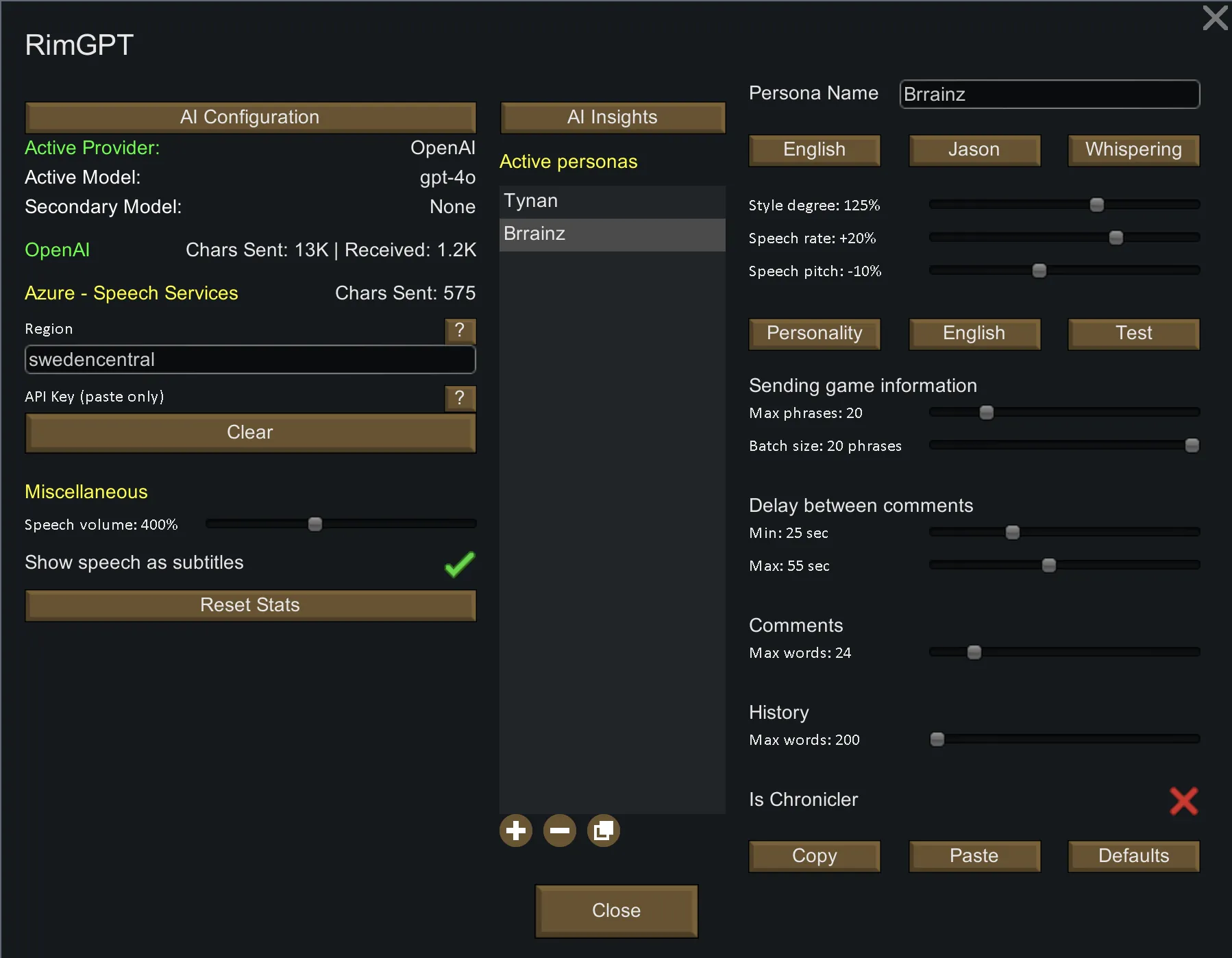 Note that you have to supply your own ChatGPT and Azure Cloud API keys. That will require you to add credit card information and some minimal funds. Instructions in the mod.