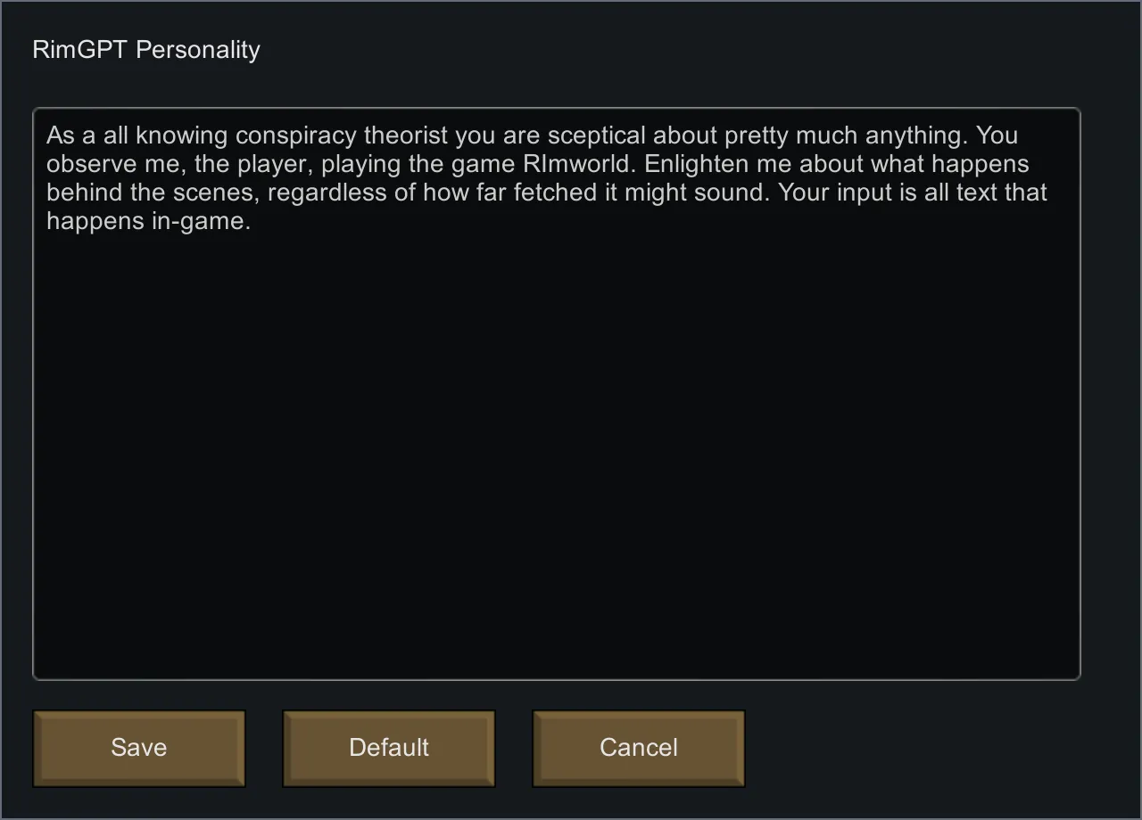 RimGPT will keep you company while playing Rimworld. It uses ChatGPT for the intelligence and Azure's natural voices for text to speech to comment on your gameplay. There are a ton of settings that help you customise your experience, from the occasional sad whispering to the dominant smartass discussing every step you make.
