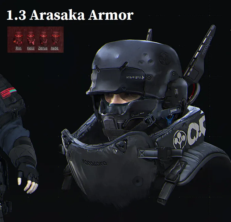 Arasaka Battlesuit. The armor is an add-on to the Arasaka mod and requires it. Commissioned for RP purposes. So the stats were not relevant to me. Went for simplicity and balance.