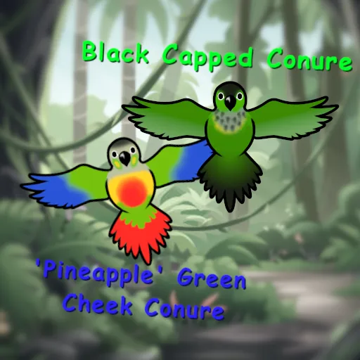 Conures are a diverse group of small to medium-sized parrots originally from the rainforests, swamps, and fields of Central and South America, often referred to as New World Parrots. Known as the clowns of the parrot world they are famous for their playful attitudes, constant need for attention, and entertaining antics like hanging upside down or swaying and dancing.