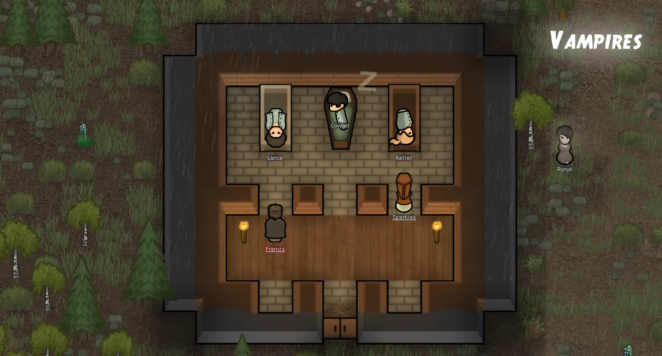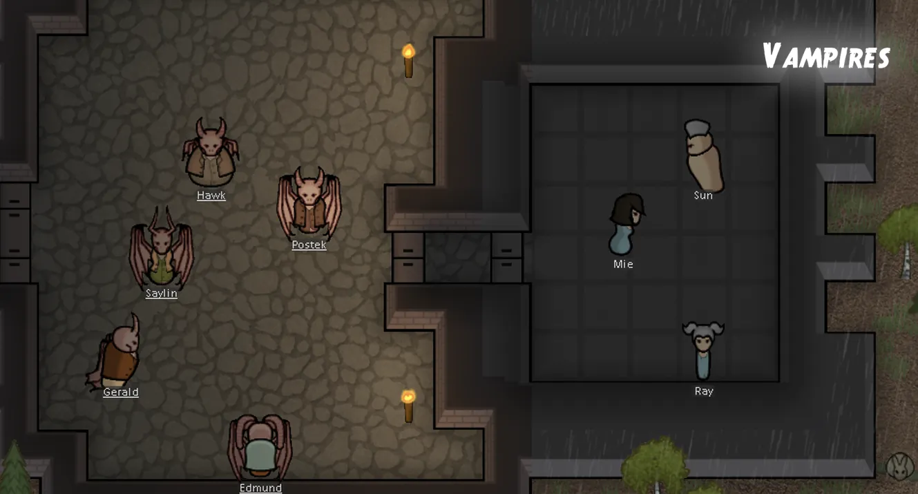 [*] b) Find a vampire out in the world. Imprison them. Recruit them. Then select them, right click another colonist, and select "Embrace (Give Vampirism)" from the right click menu options.