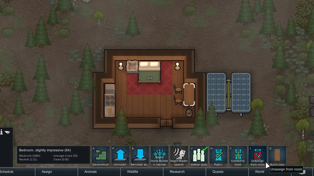 A simple tool for assigning furniture such as tables, chairs, shelves and joy objects to beds, for bedowner's use only. Pawns will not sit at the tables, use joy items, take items from shelves (but will haul them there), flick switches or refuel as long as the furniture is assigned to bed that doesn't belong to them and is toggled as 'assigned to bed'.