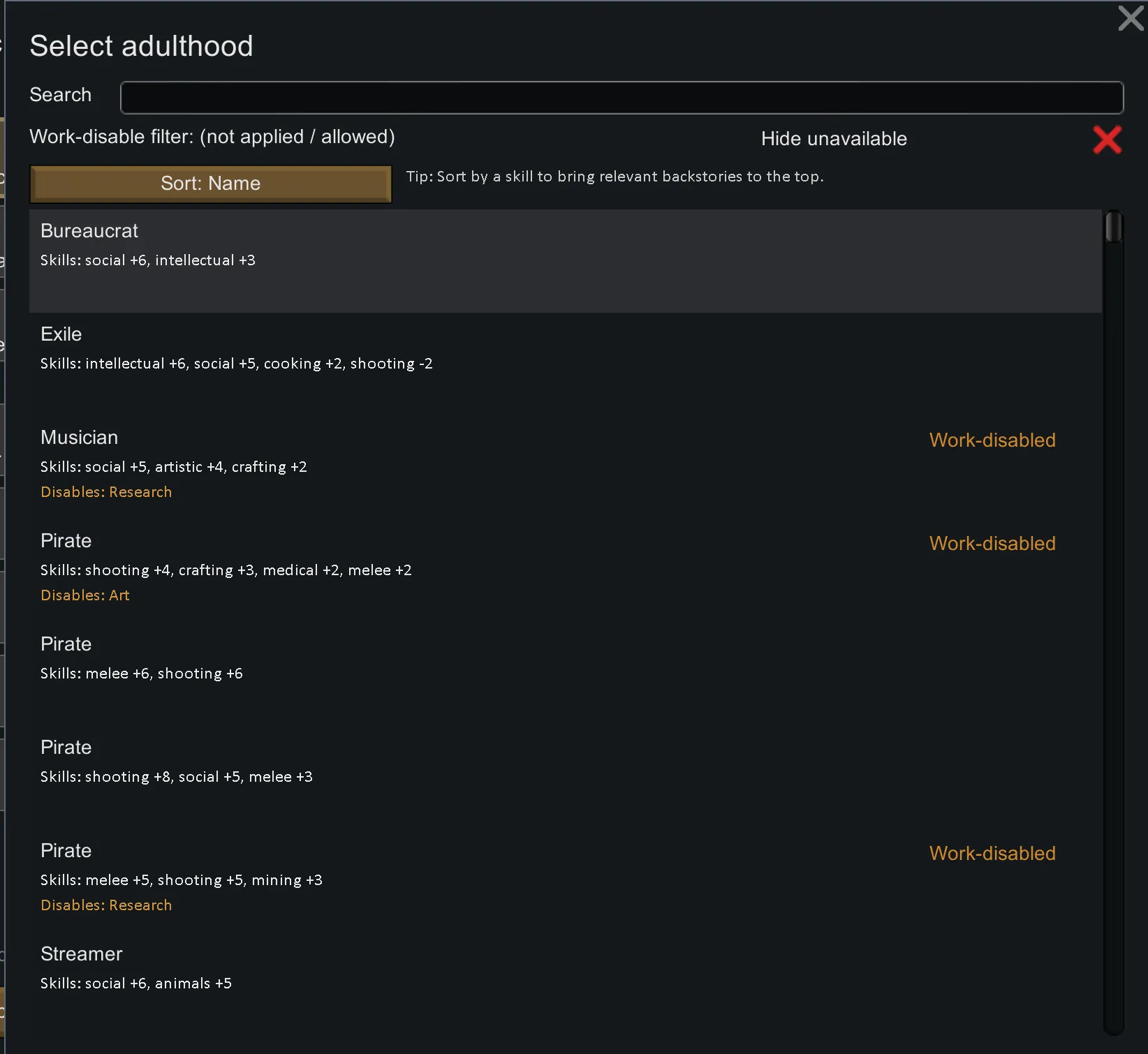 Patch-only addon for RandomPlus. It hard-locks the selected childhood/adulthood backstories in the filter UI (100% lock) and fixes post-lock skill mismatch (skill regeneration).