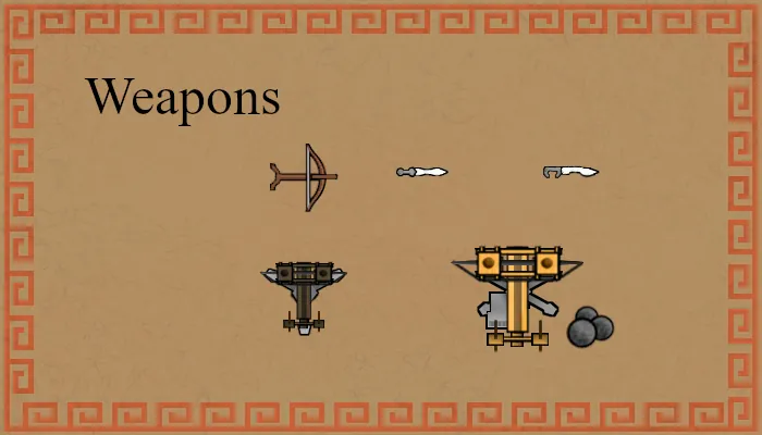 Weapons: Swords, a belly bow and siege engines