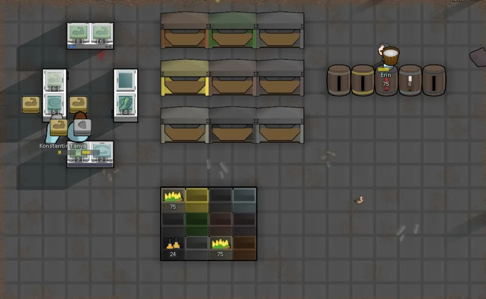 [b]Bin[/b]: 100 buildable stuff. Stores up to 6 stacks of loose resources, but is faster to use than the skip. Can also only store one type of item at a time. Currently supports raw food, raw plants, textiles, drugs, pemmican, kibble, herbal medicine. Open to adding more items on request. Requires Machining to unlock.