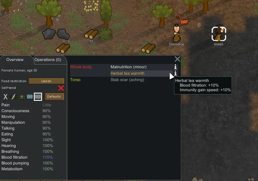 Adds Herbal Tea, a refreshing beverage brewed from from Herbal Medicine which gives a bit of joy while slightly improving blood filtration and immunity gain rate. It functions as an early-game medicine to help fight infections and disease.
