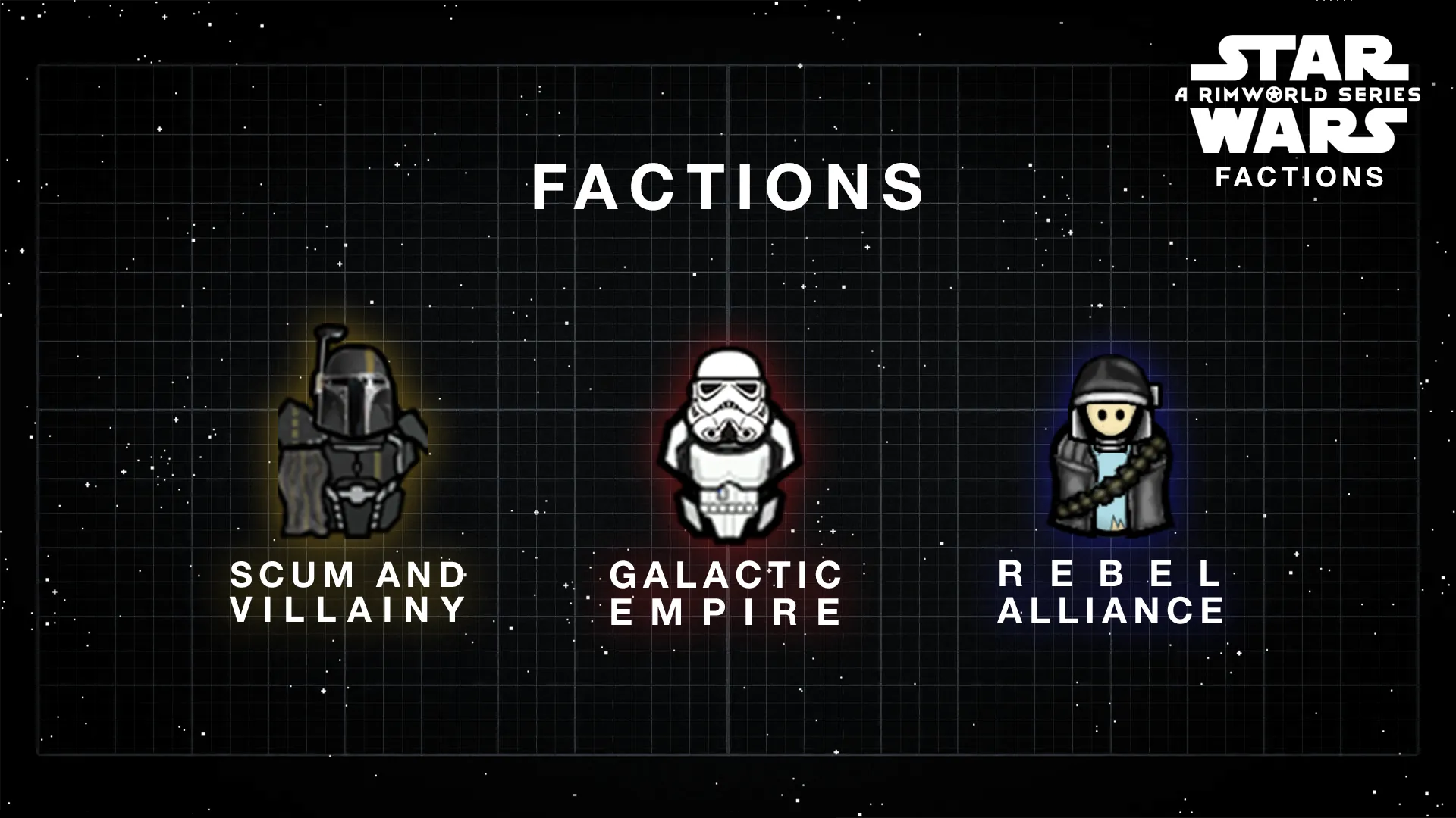 Adds classic Star Wars factions to RimWorld: the Galactic Empire, Rebel Alliance, and other scum and villainy