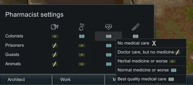 The Pharmacists' advice for each of these can be set for Colonists, Guests, Prisoners and Animals separately with the 'Pharmacist' button on the main bar.