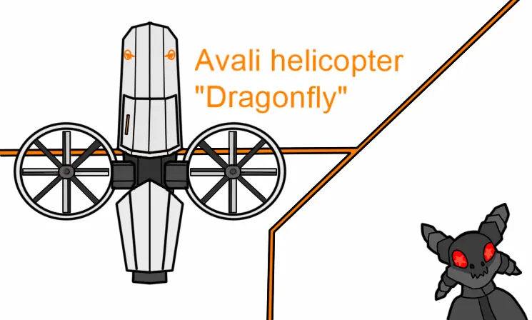 Avali helicopter "Dragonfly". Probably the most favorite helicopter for Avali pilots due to its lightness, speed and very good maneuverability in flight. It can also carry 4 bombs.