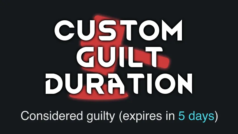 This mod adds a settings menu where you can set your own [b]fixed duration of guilt[/b] or enable [b]"per violation" guilt stacking[/b]. (does not affect Trial verdicts)