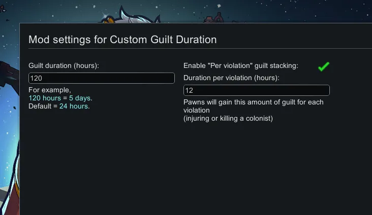 By default this mod sets the guilt duration to 120 hours (5 days). Vanilla setting is 24 hours (1 day).