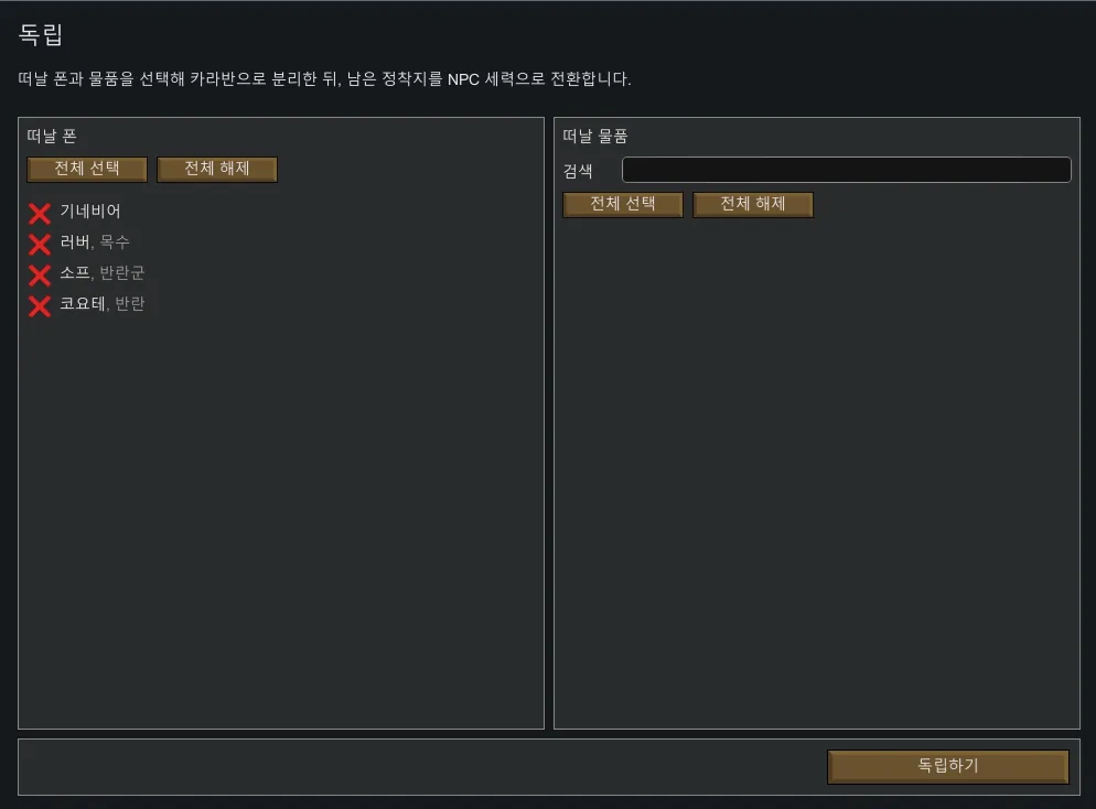 게임 화면 하단에 독립 버튼을 추가하여 선택한 폰과 아이템을 상단으로 분리해 새로운 세력으로 만들 수 있습니다. 남겨진 폰과 정착지는 NPC 세력으로 전환됩니다.