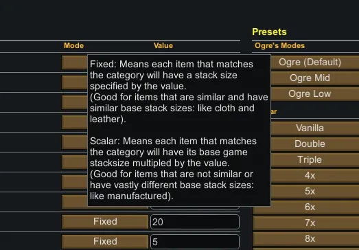 [*] Added various buttons for Presets in the settings window, should make setting stack sizes even faster